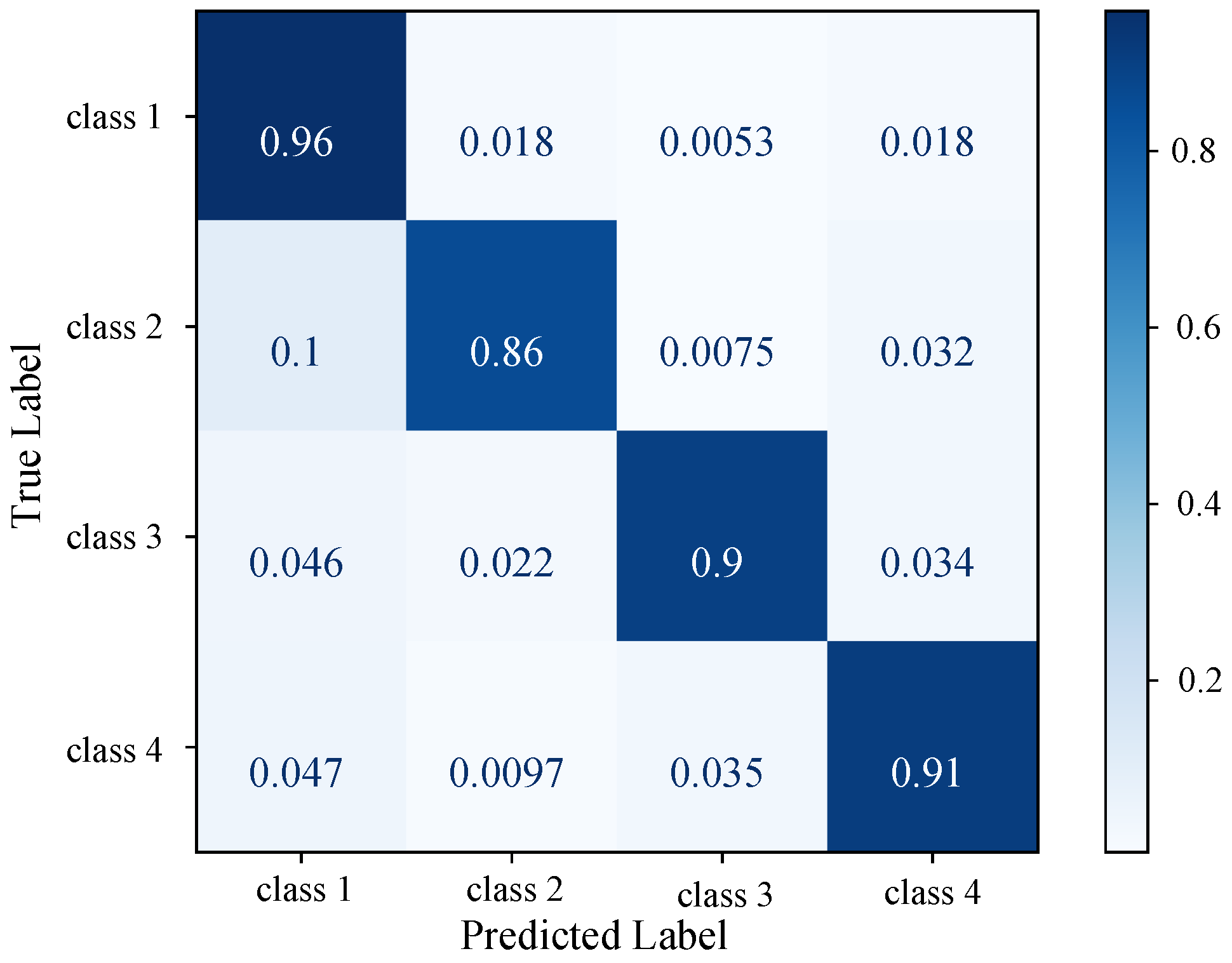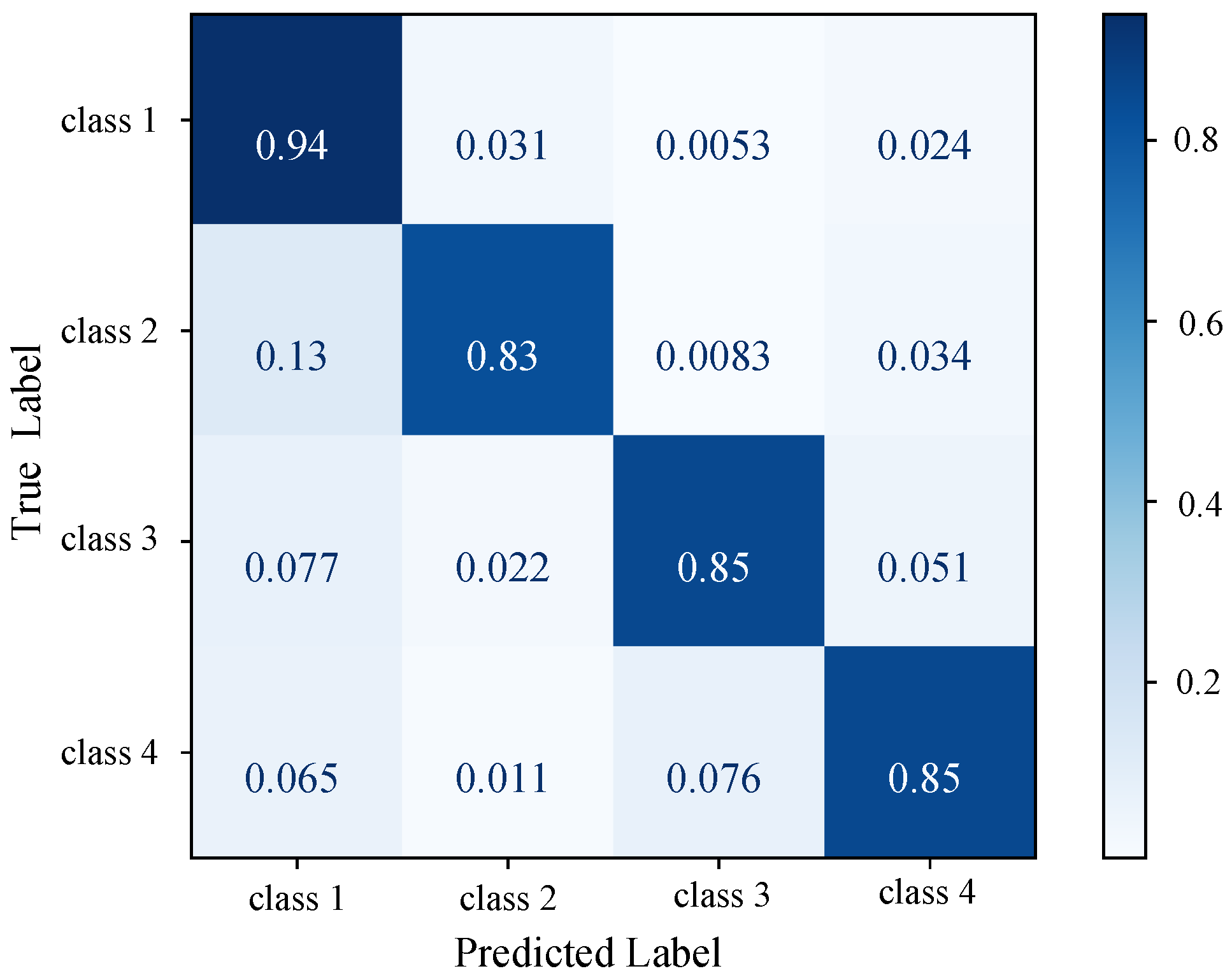 STEGNN Confusion matrix on the out-of-sample test dataset with unseen topologies. Four classes (class 1, class 2, class 3, and class 4) correspond to one-hot labels , , , and .