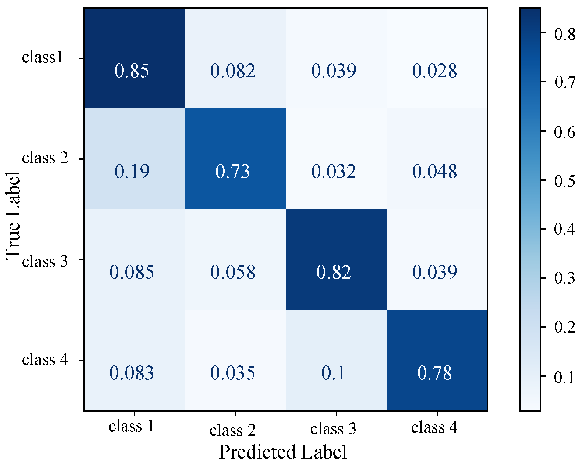 STCGCN confusion matrix on the out-of-sample dataset. Four classes (class 1, class 2, class 3, and class 4) correspond to one-hot labels , , , and , respectively.