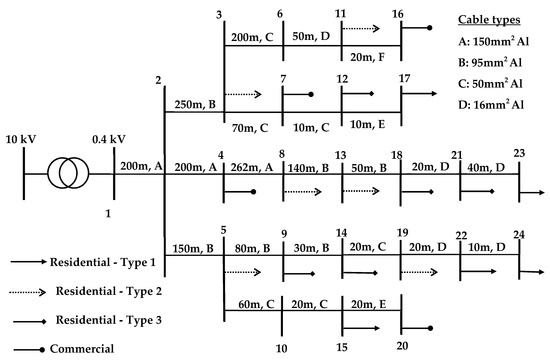 - values for loads are determined using Relation (4), the correlation coefficient between different types of loads (e.g., correlation coefficient between residential and commercial loads), and the correlation coefficient between loads and PVs (). A perfect positive correlation (= 1) is assumed between loads of the same type, as well as between active and reactive power consumption.