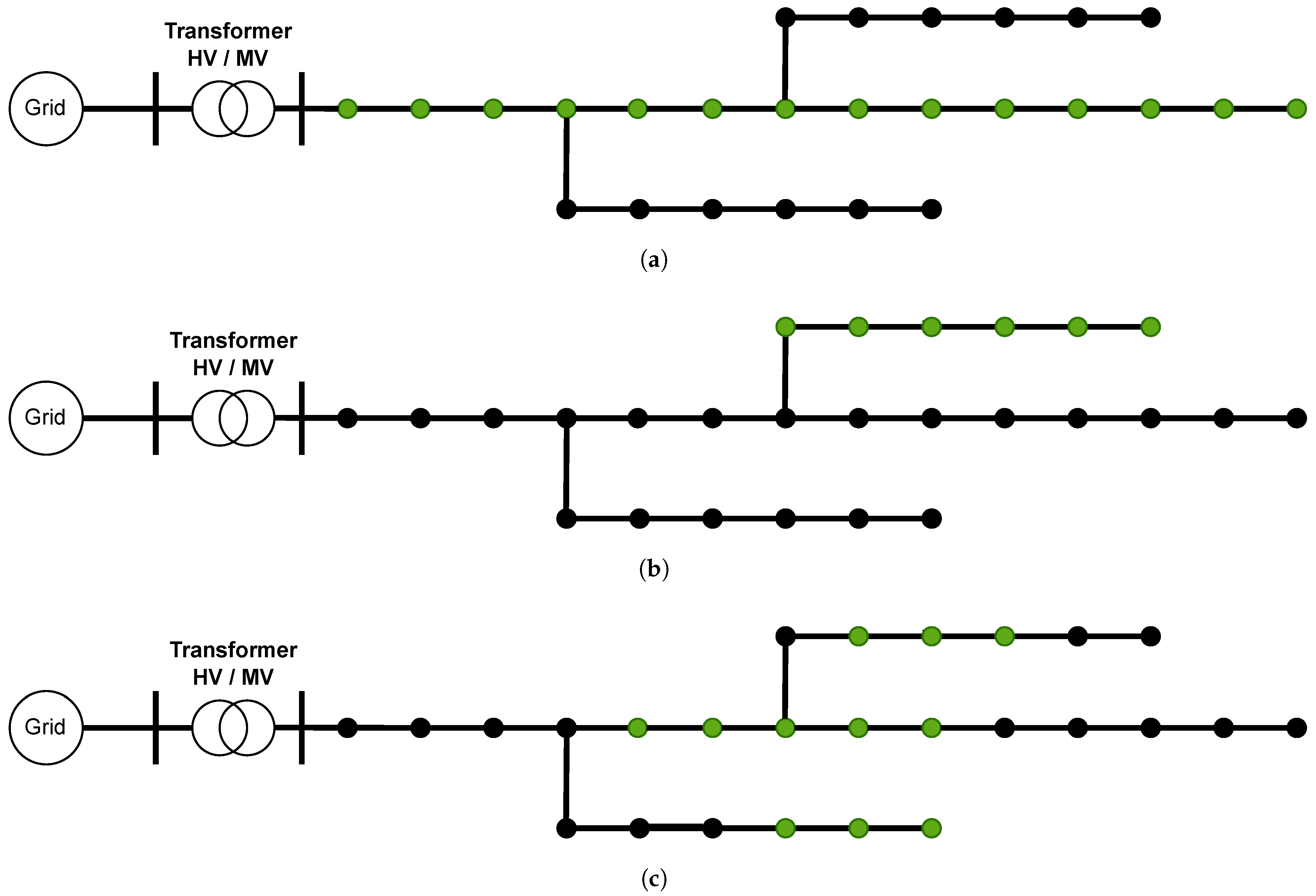 - Constraint on PV locations: This constraint evaluates the impact of excluding selected network zones from PV interconnections and its effect on the HC solution. The binary variable in (24) acts as an activation flag for the candidate PV nodes: ensures that node j is not available for PV integration. In addition, the parameter limits the number of candidate nodes that can host PV systems. For example, this setting is useful when the planner seeks to determine the HC associated with a single PV system interconnected at a single node within a feasible candidate set.Figure 2 shows a radial distribution network with one main feeder and two laterals. All nodes are at the MV level. Three candidate node configurations (in green) are illustrated for HC estimation. In Figure 2a, candidate nodes lie along the main feeder; Figure 2b considers only nodes on a lateral feeder; and Figure 2c includes both main- and lateral-feeder nodes, a typical case when potential interconnection points for distributed generation projects have been identified. An analysis of the HC estimate with zone restrictions can be useful for planning protection device upgrades when certain PV system locations impact protection coordination.Figure 2. Candidate nodes (green) for PV interconnection in three scenarios: (a) All nodes on the main feeder. (b) All nodes on the lateral feeder. (c) Selected nodes based on the PV interconnection potential.Figure 2. Candidate nodes (green) for PV interconnection in three scenarios: (a) All nodes on the main feeder. (b) All nodes on the lateral feeder. (c) Selected nodes based on the PV interconnection potential.