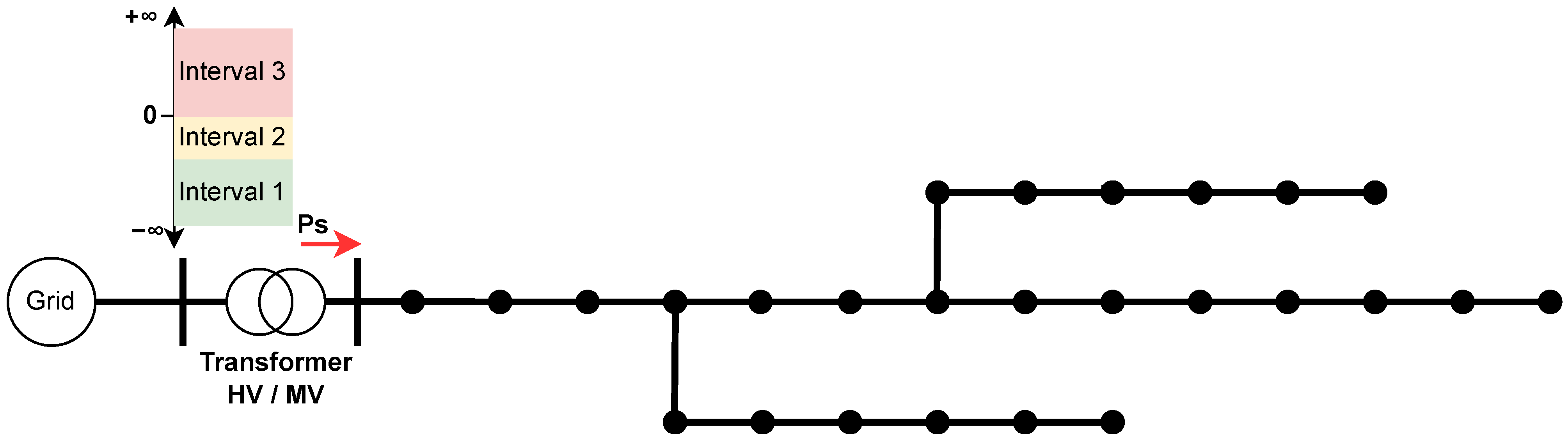 - Constraint on power exchange with the upstream grid: The active power at the slack bus can be constrained to the reference value selected by the planning team. In Figure 3, represents the active power injected into the slack bus from the upstream grid. From Equation (23), . Figure 3 shows three feasible intervals for . For instance, selecting = (Interval 1: (, ]), where denotes the rated power of the element connected to the slack bus, yields a solution limited by the feeder export capability. Setting = (Interval 2: (−, 0)) causes constraint (23) to become binding before reaching the maximum export capability . Finally, choosing = 0 (Interval 3: [0, )) limits active power export to the upstream grid, which is relevant when planners identify the operating conditions under which export must be avoided. In general, tuning enables the assessment of the impact of active power export constraints on HC results and overall network performance.Figure 3. Possible settings of the upstream-grid power-exchange constraint.