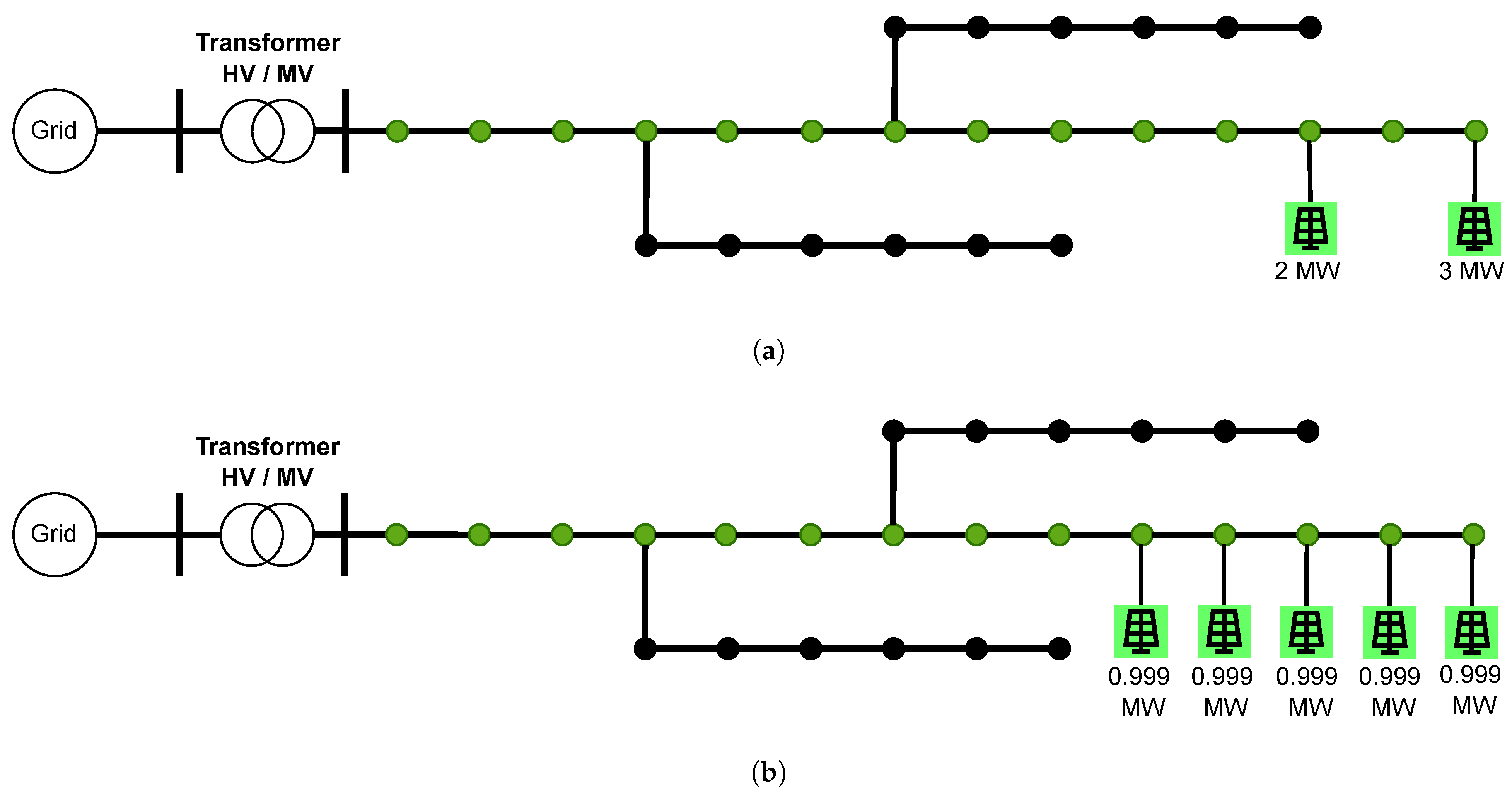 - PV unit capacity constraint: Variable is limited by the parameter in (24). This enables the analysis of scenarios with many small-scale projects versus scenarios with fewer, higher-capacity projects. In Colombia, for example, regulation distinguishes between distributed generators below 1000 kW and plants with a capacity greater than or equal to 1000 kW. This framework has led to a preference for PV systems below 1000 kW, given the less-demanding permitting processes. Therefore, for planning teams, it is relevant to assess how this constraint affects HC in their distribution networks.Figure 4 illustrates two PV integration scenarios. In Figure 4a, the HC solution does not impose a per-unit capacity limit within the candidate node set, and a total of 5 MW is obtained with two interconnected PV systems. In Figure 4b, the HC is also 5 MW, but five PV systems are interconnected because each unit is constrained to have a capacity below 1000 kW. Although the total HC is 5 MW in both cases, the locations and number of PV units can affect the distribution network performance in different ways, for example, in the resulting energy losses.