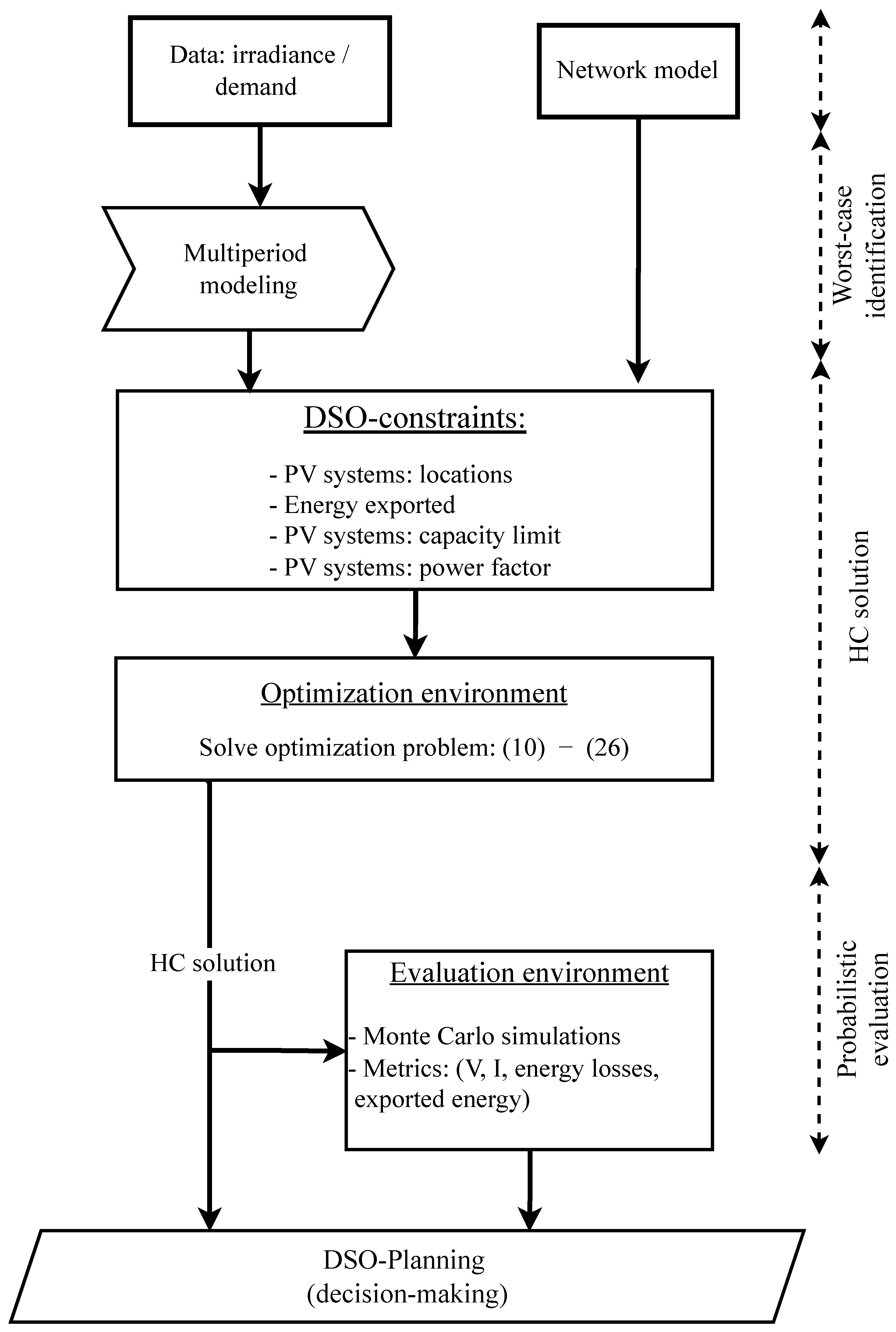 - The input data comprise the network model, historical active and reactive demand, and solar irradiance records. The demand and irradiance time series must be time-aligned over the analysis window.