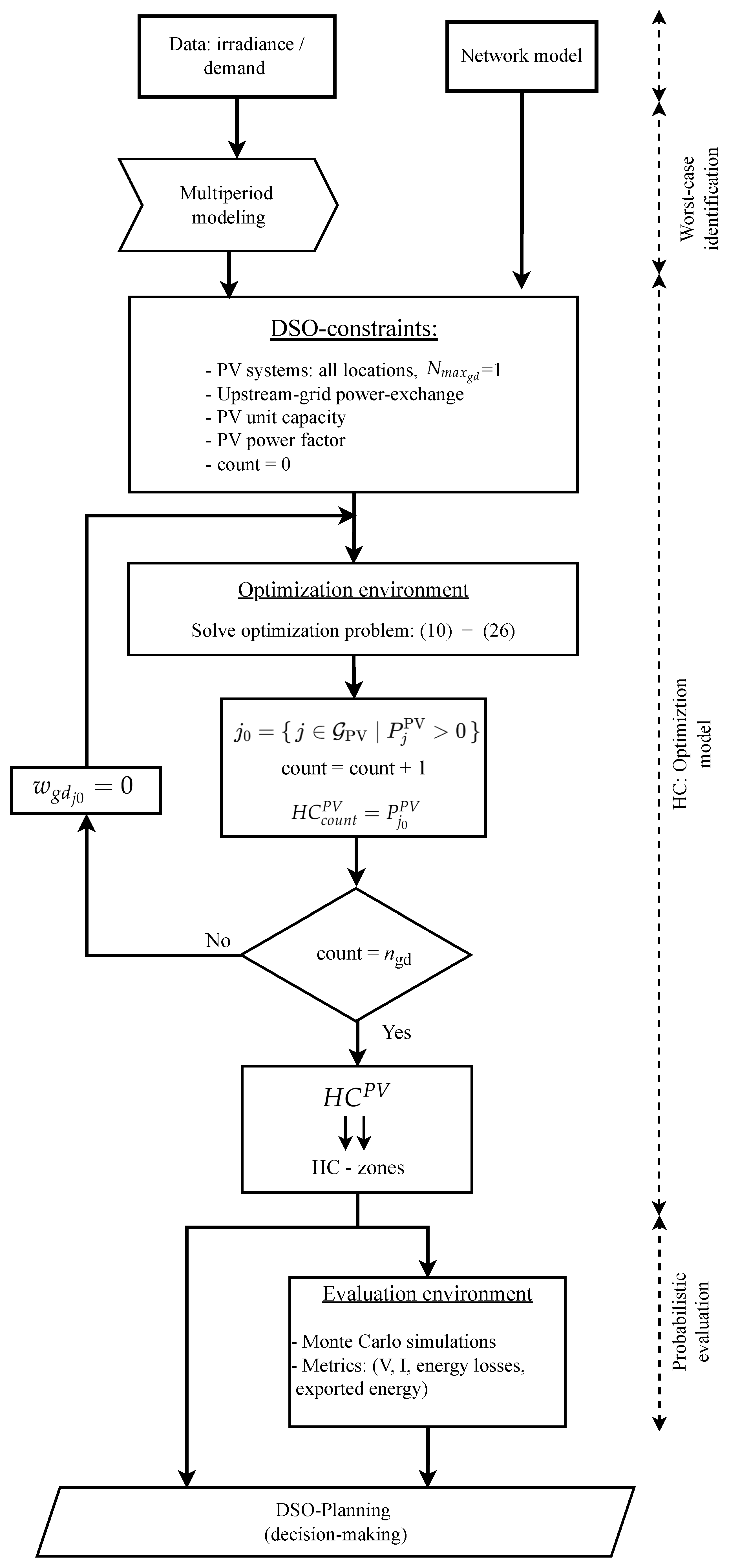 - An optimization model for PV-HC estimation that uses an MIQCP formulation without linearizing approximations enforces the operating limits and planning constraints relevant to the DSO and yields accurate PV-HC solutions. The model includes configurable constraints to assess the impact of per-unit generation caps, power exchange with upstream grids, and other factors. This method is formulated to determine the HC without considering investments in new operational functionalities that increase DG integration.