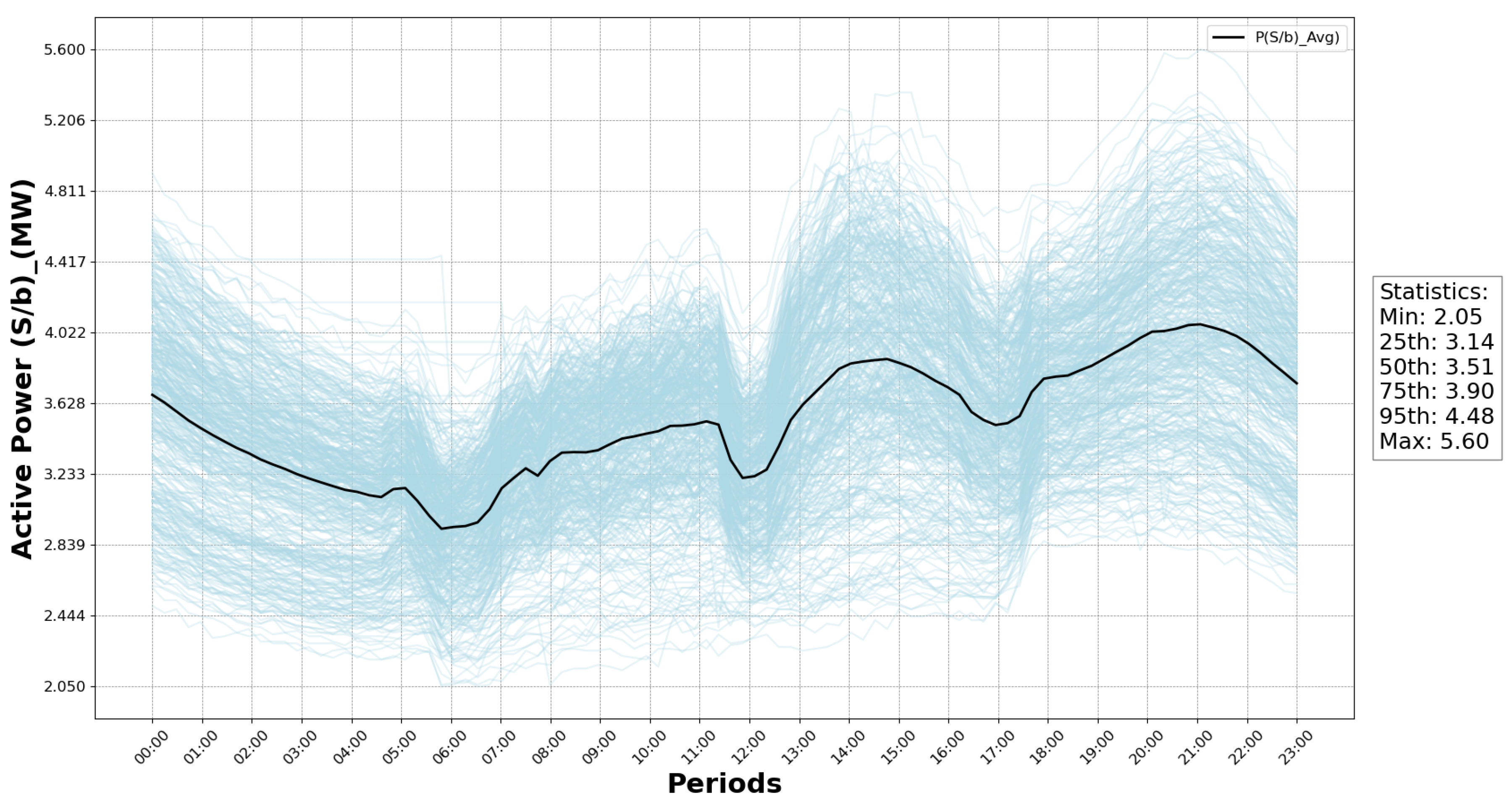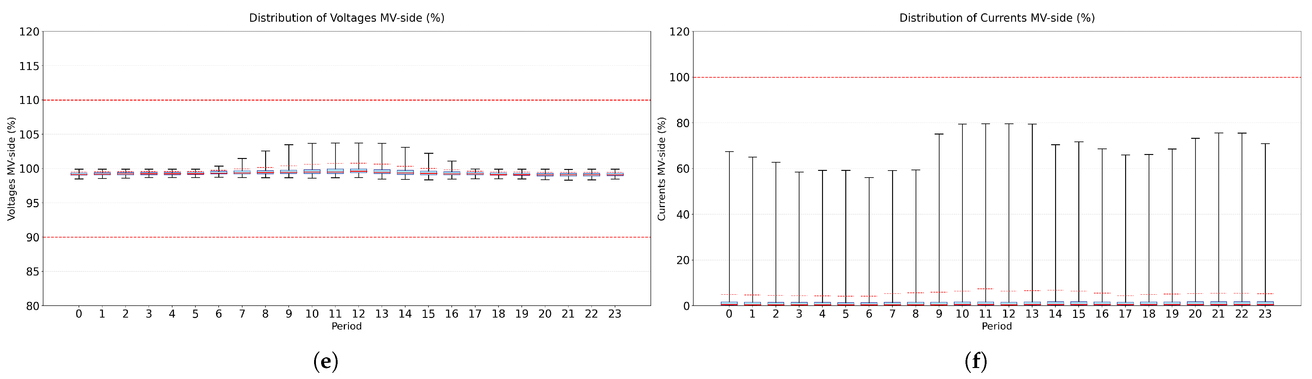 - The resulting HC solution is assessed by the DSO planning team. The same HC solution, defined by PV locations and injection capacities, is then used in a probabilistic evaluation based on Monte Carlo simulations, which analyze power flows under demand and irradiance uncertainty. This probabilistic evaluation yields metrics that verify compliance with voltage and current limits at all nodes and elements and provides central-tendency values for exported energy and energy losses.
