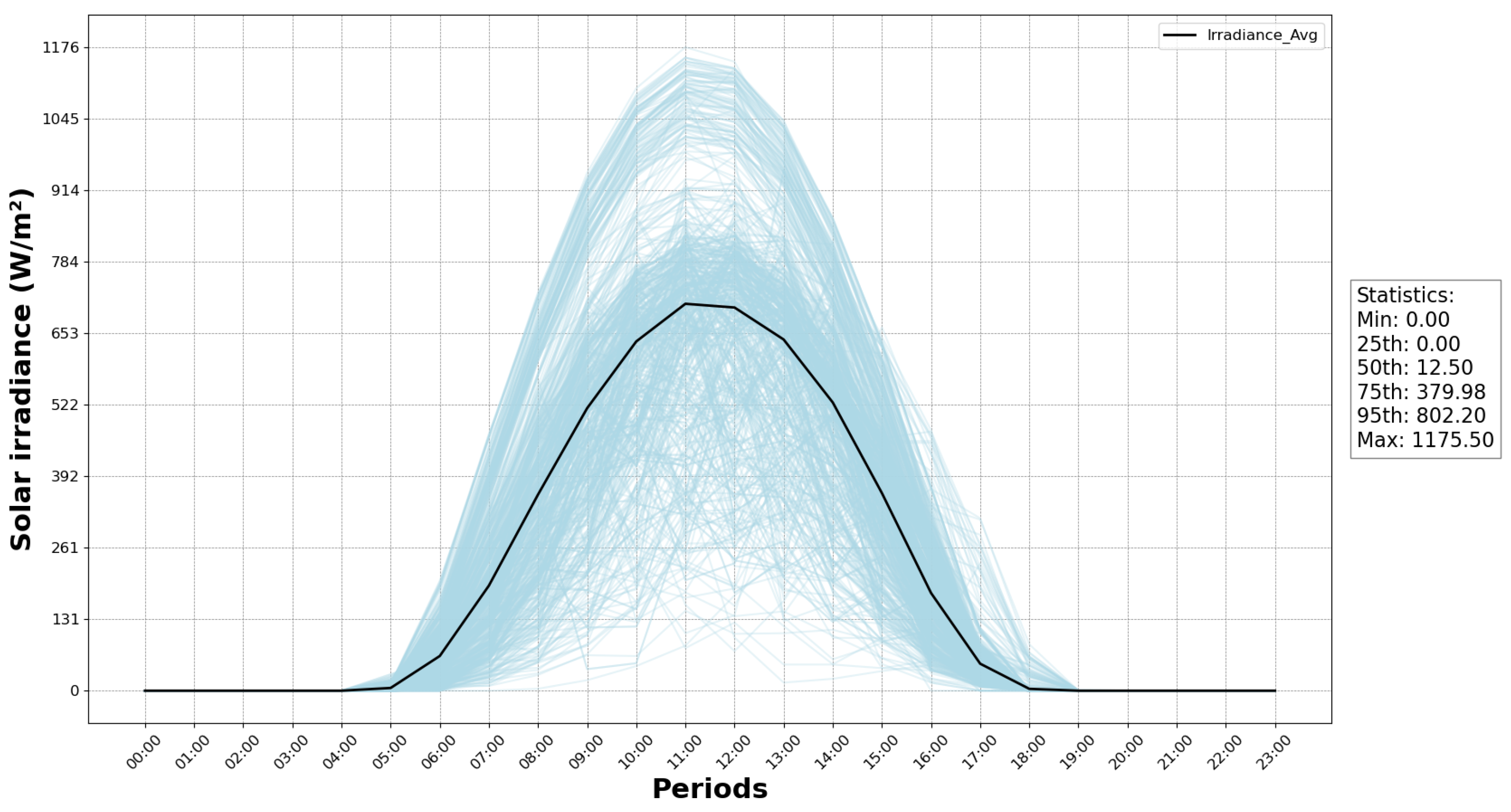- Probabilistic model of solar irradiance in the feeder’s area of influence.