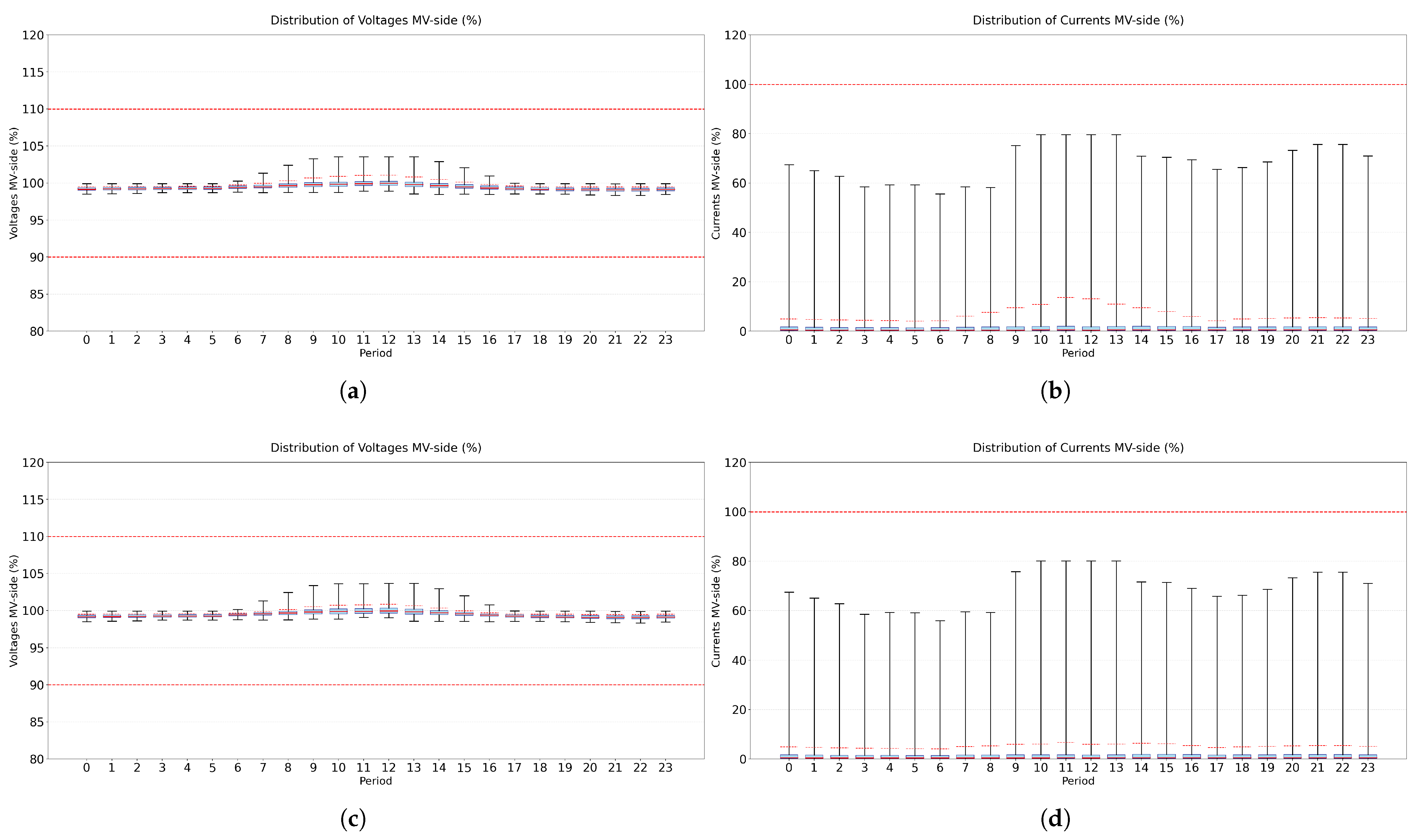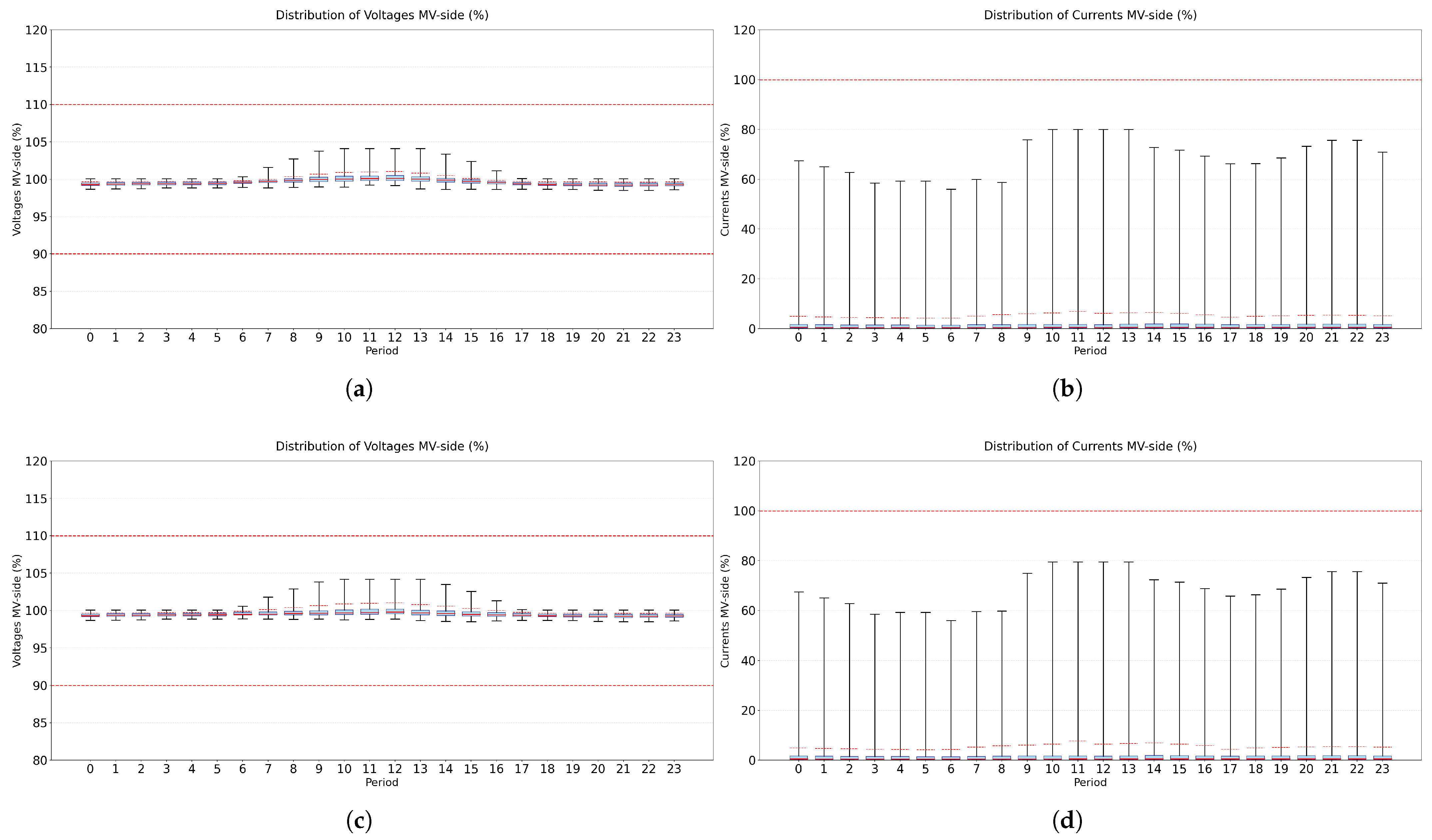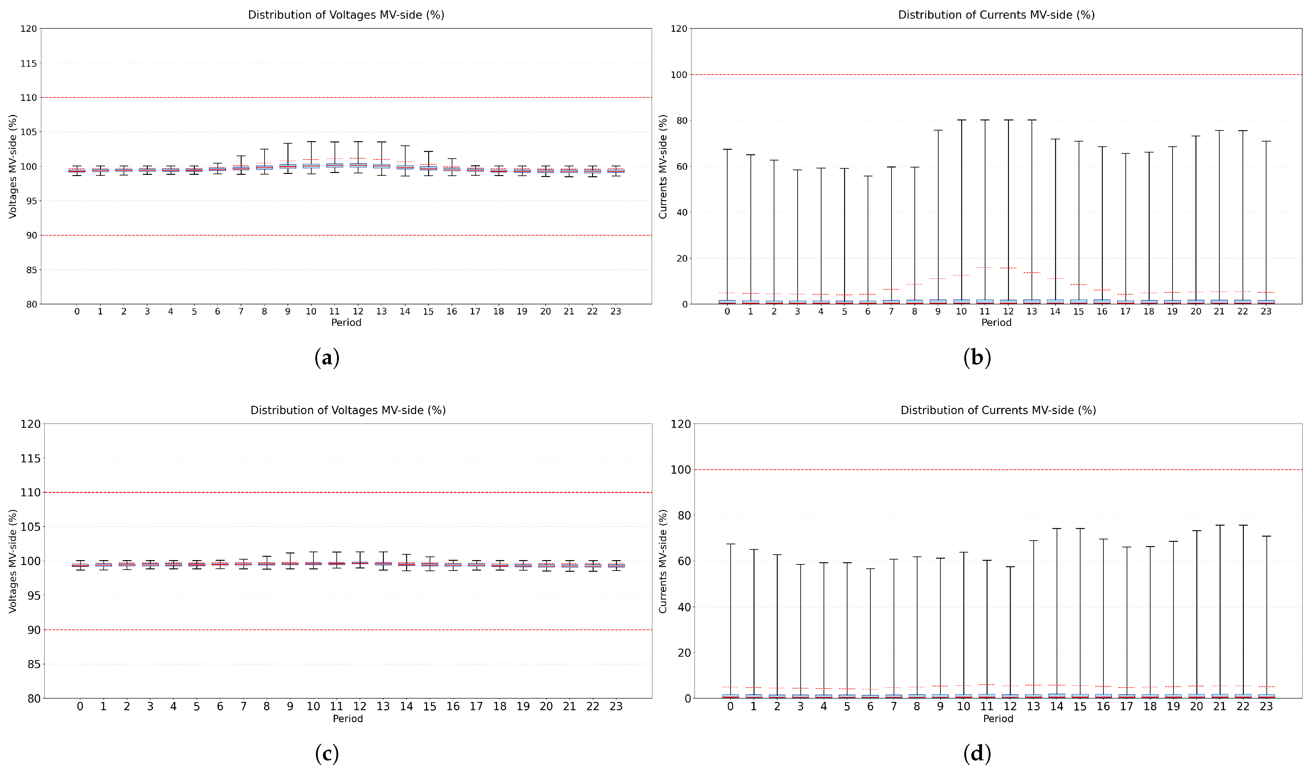 - PV system power factor constraint: The parameter in constraint (25) can be set to different values to assess the impact of allowing reactive power flow at PV terminals. This is useful for quantifying the benefits of reactive power management as an operational control mechanism to increase HC in the network, as reported in the literature.
