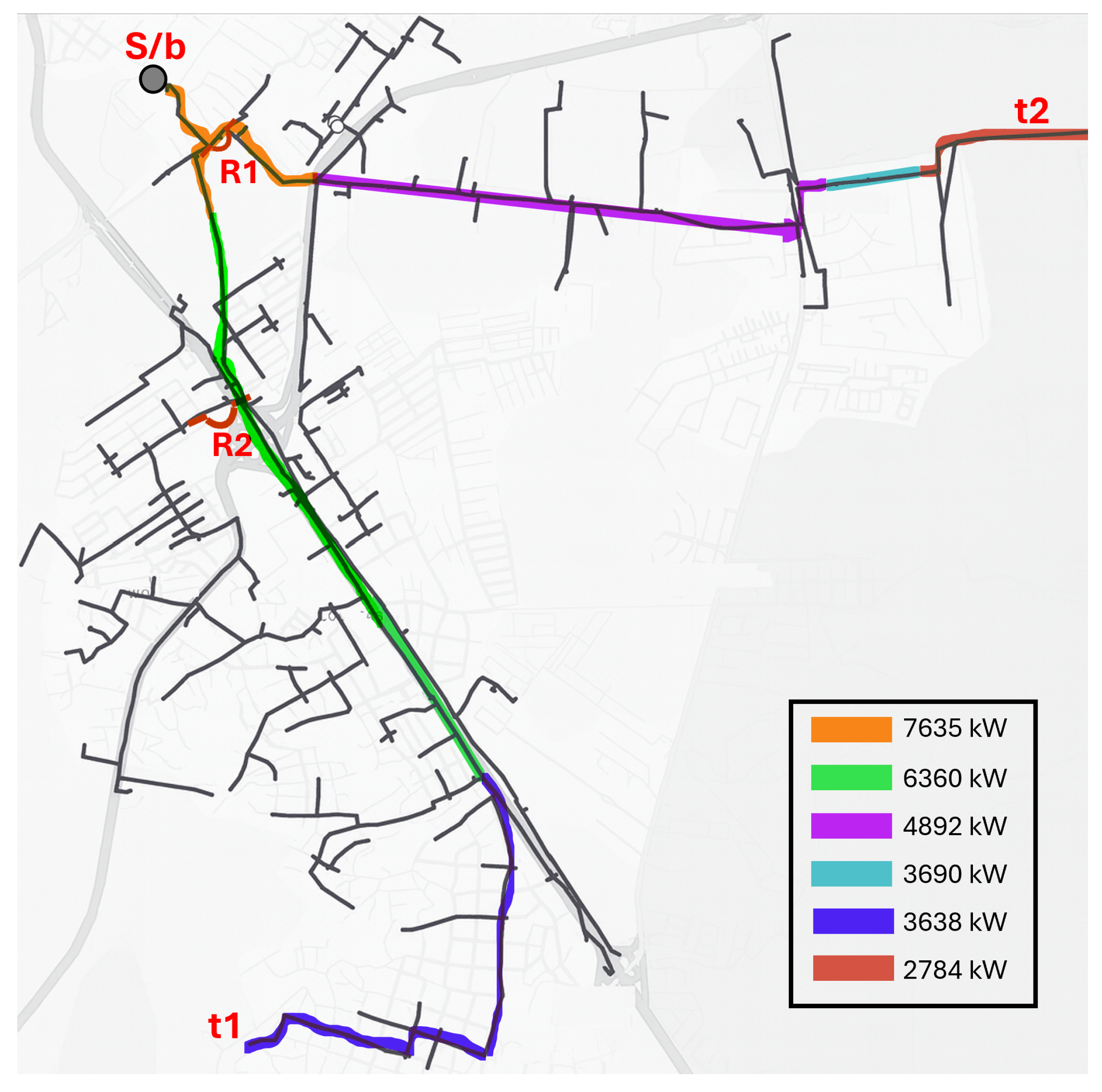 - The optimization problem is solved using the network model, multiperiod model, objective function in (10), and constraint set in (11)–(26). The HC solution is given by the sum of all the PV capacities obtained, identifying each MV node with a PV installation and its corresponding maximum injectable power.