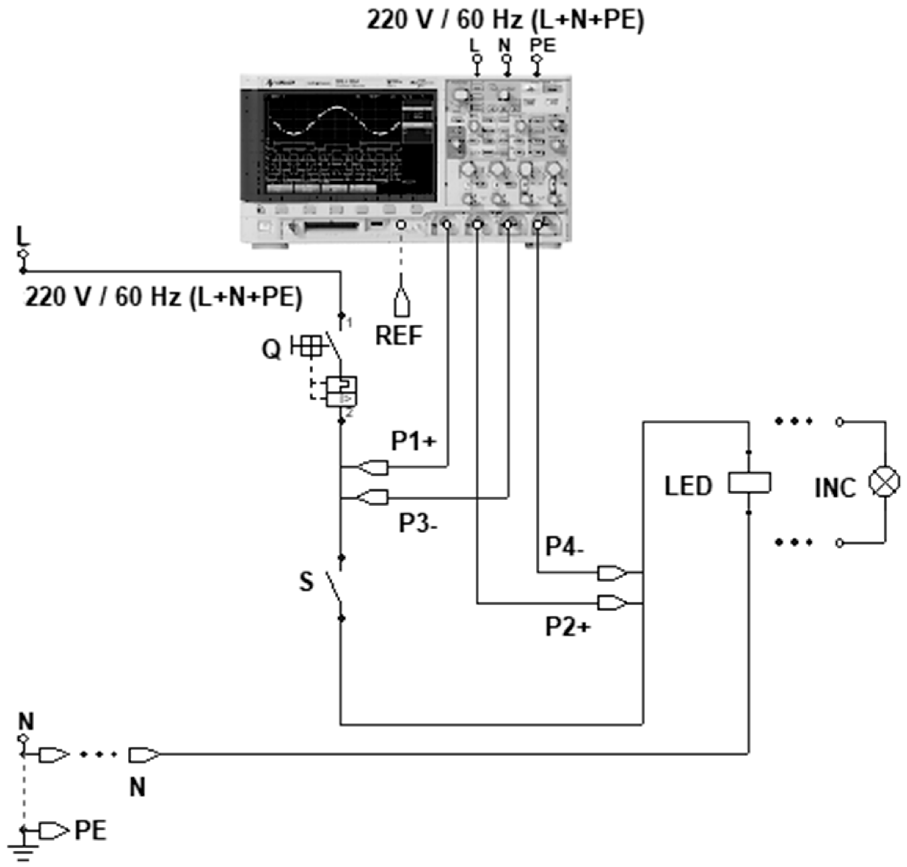 RMS (Root Mean Square Voltage), 60 Hz utility mains system composed of Phase (L), Neutral (N), and Protective Earth (PE). The oscilloscope employed was a Keysight