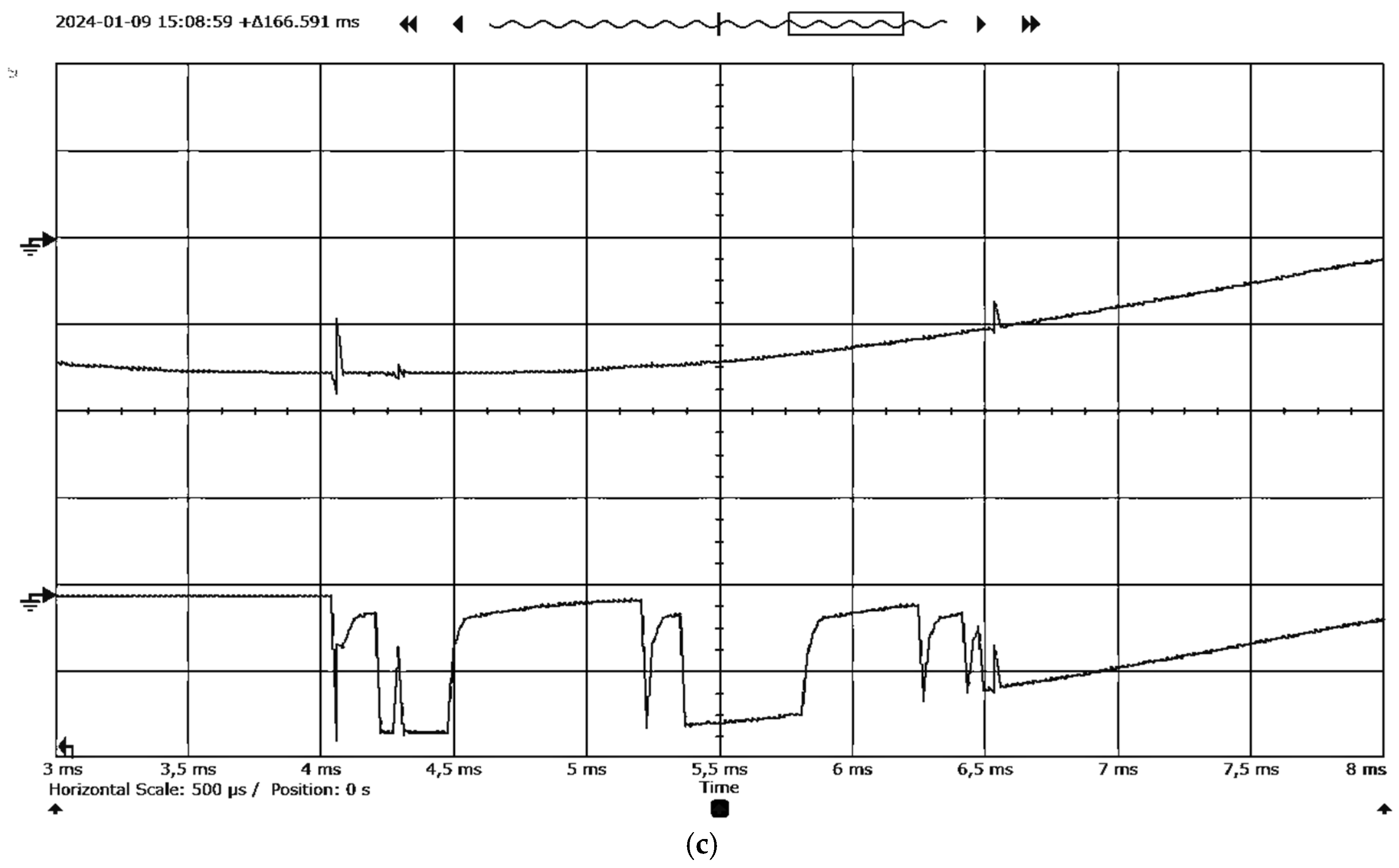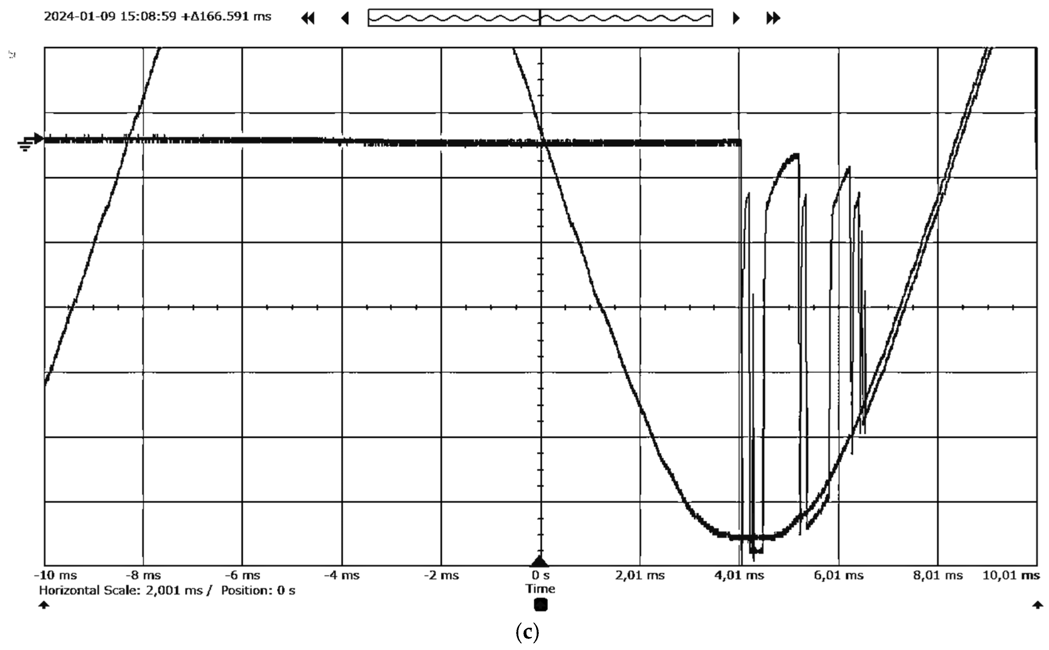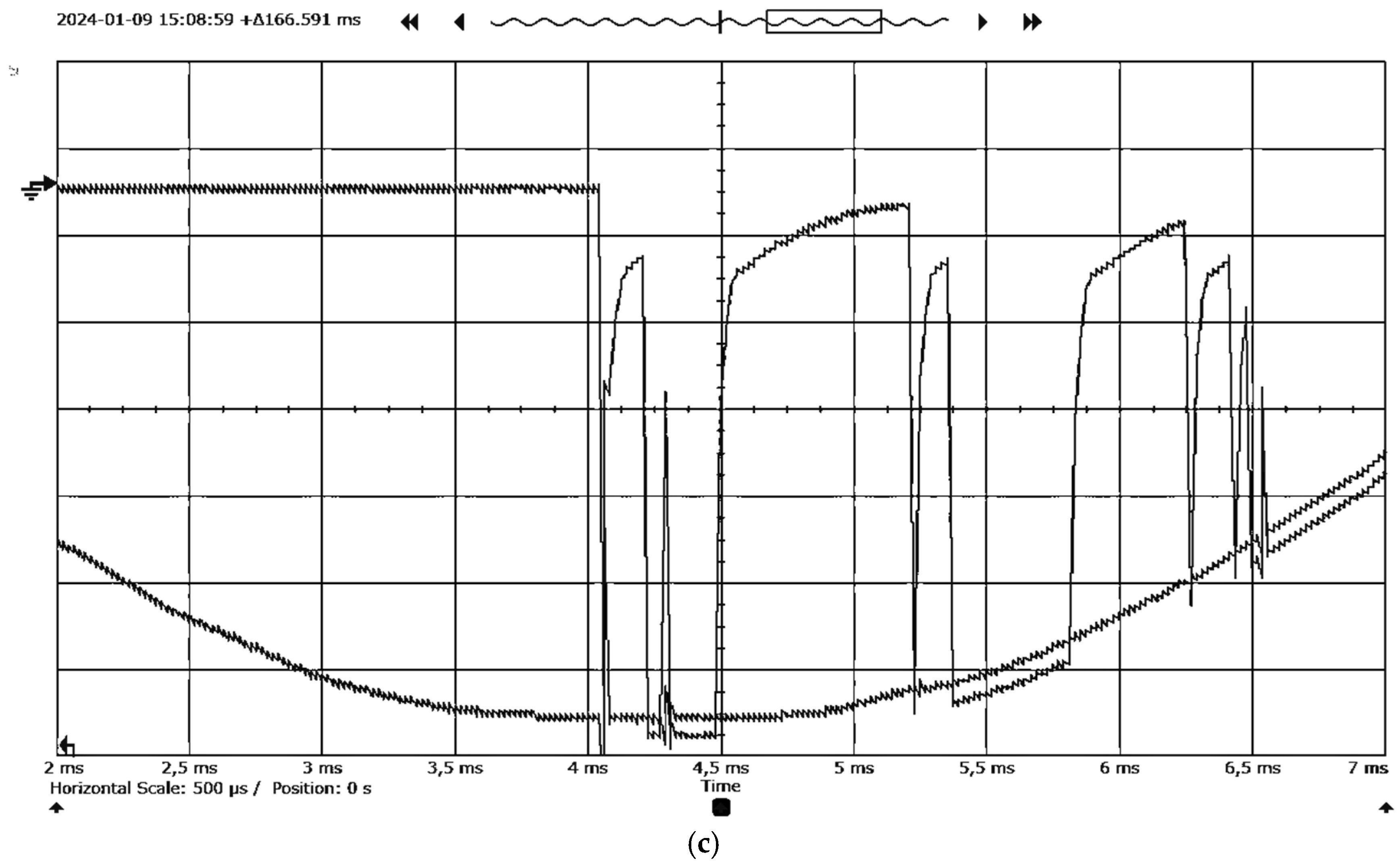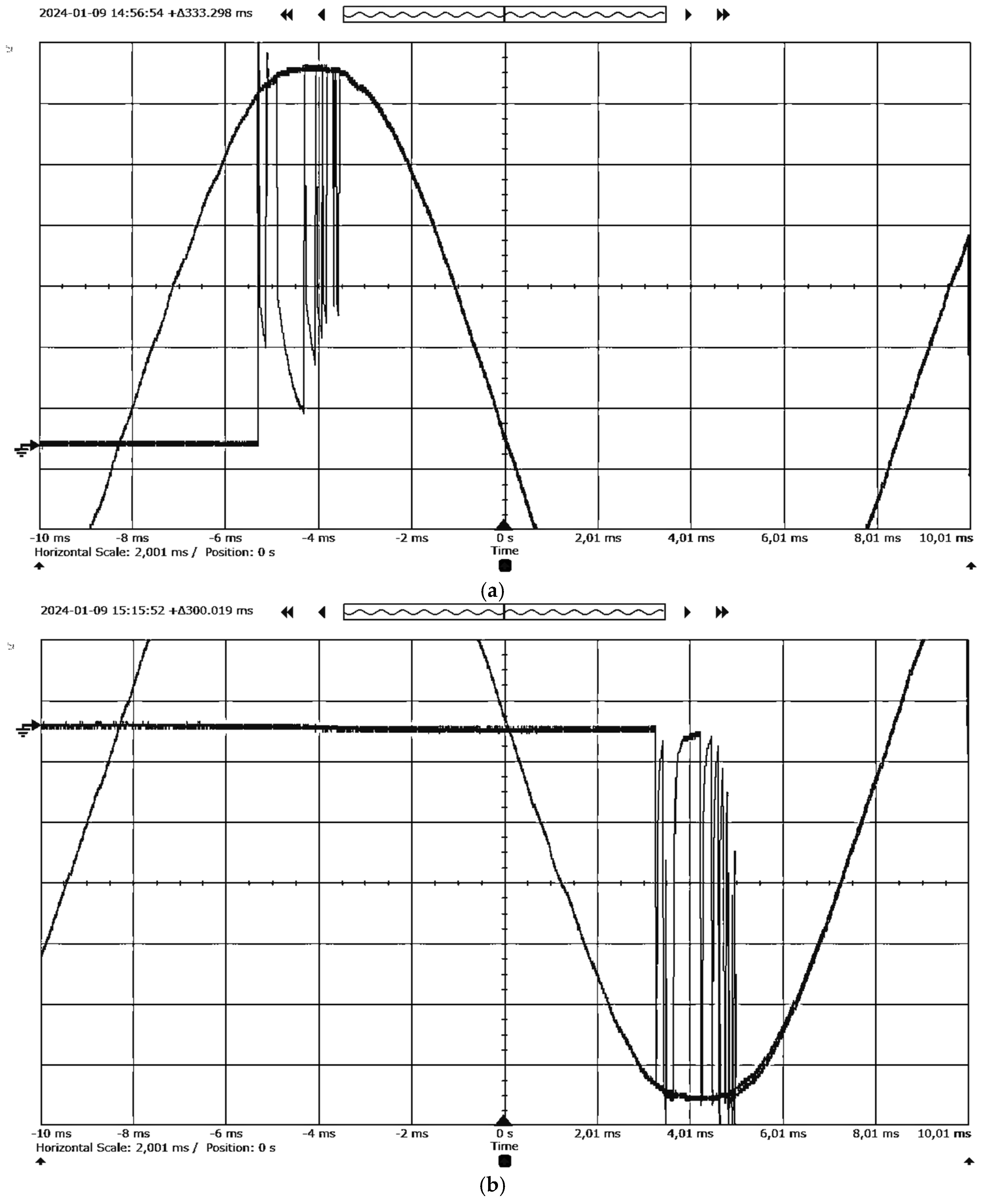 The experimental setup off oscilloscope was as follows: 50 V/div vertical scale, 10:1 probe, single-ended type with common ground, and a measurement range compatible with peak values of up to approximately 390 V, with a vertical offset position of 130 V. The oscilloscope’s measurement range did not allow coverage of the entire peak voltage span (from +311 V~ to −311 V~). Therefore, a four-channel oscilloscope was used, with all channels operating simultaneously as follows: