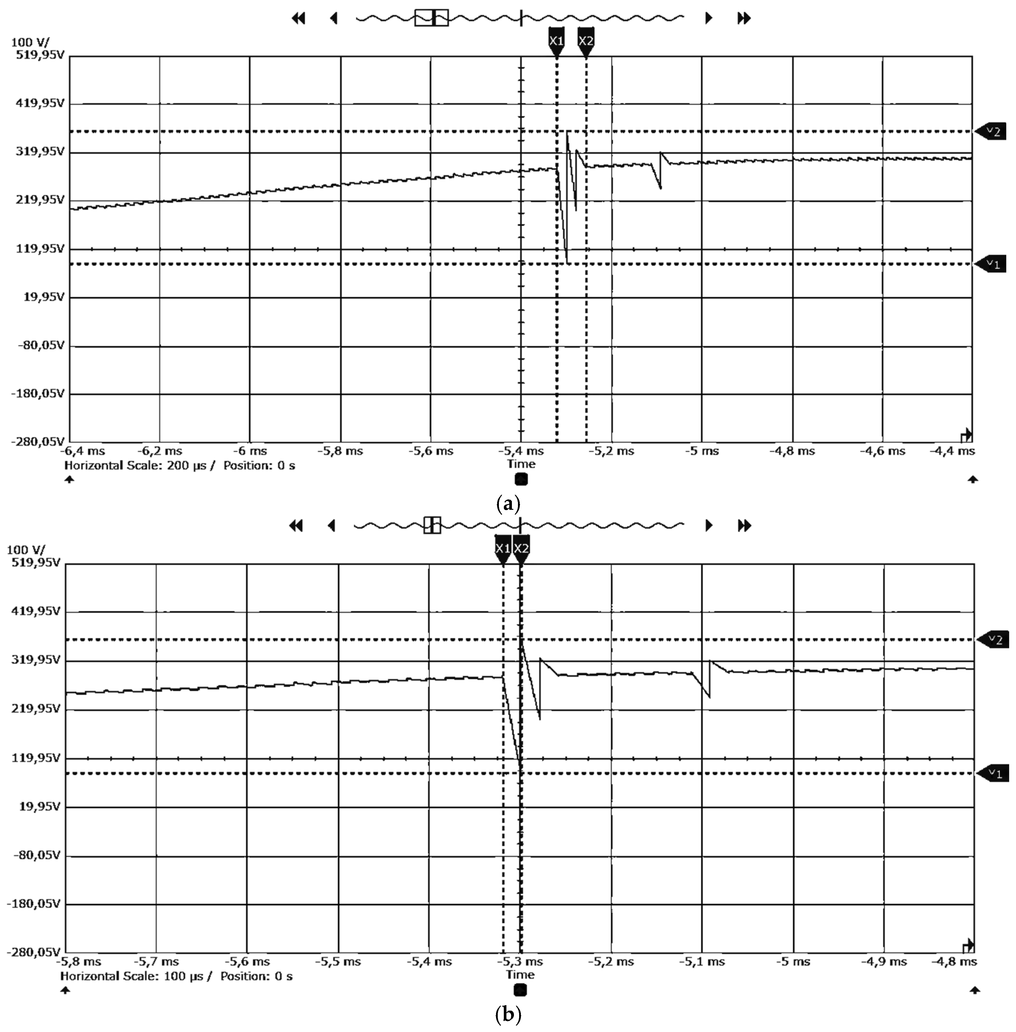 Figure 11, which represent the disturbances observed in the lamp circuit. It can be seen that the lamp voltage varied from −342 V to −3 V, resulting in a total variation of 339 V (373 V in the worst case). At a given moment during the disturbance, this voltage variation occurred within 21 µs (±2 µs), corresponding to a voltage rate of change over time of approximately 16 V/µs (20 V/µs in the worst case).