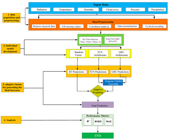 This section presents the methodological framework of the proposed TCN-GRU-RF model. The architecture integrates the complementary strengths of TCNs, GRUs, and RFs through an optimized fusion mechanism. An overview of the framework, including data preprocessing, individual model training, and the ensemble fusion process, is illustrated in Figure 1. As shown in Figure 1, the framework consists of three main stages: (1) data acquisition and preprocessing, (2) individual model development (TCN, GRU, and RF), (3) optimized fusion for generating the final forecasts, (4) and results analysis.