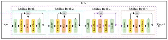 Residual connections, as illustrated in Figure 2, facilitate gradient flow through deep networks and mitigate the vanishing gradient problem. A typical TCN residual block comprises two dilated causal convolutional layers, each followed by weight normalization, ReLU activation, and dropout regularization. The residual connection is formulated as follows: