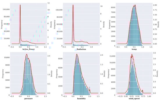 Before evaluating the forecasting models, it is essential to understand the statistical characteristics and temporal dynamics of the dataset. Figure 5 presents the statistical distribution of the key input variables utilized in this study. As observed, Active Power and Radiation exhibit a zero-inflated distribution, heavily skewed due to the diurnal nature of solar generation (nighttime values). Temperature follows a near-Gaussian distribution, whereas Humidity and Wind Speed show skewed or bimodal distributions. These non-linear and non-Gaussian characteristics justify the use of deep learning models like TCN and GRU, which do not rely on normality assumptions.
