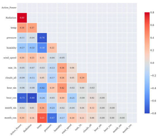 To identify the most influential predictors, Figure 6 summarizes the correlation analysis between modeling variables. PV output (Active_Power) strongly correlates with global horizontal irradiance and ambient temperature and moderately with Wind Speed and Humidity. These relationships support prioritizing these variables as primary inputs to the forecasting system.