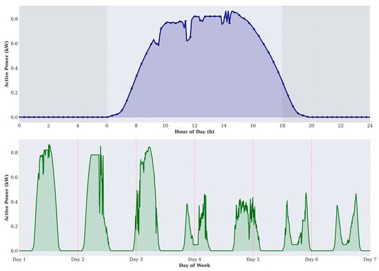 where is the imputed value at time t; and are the known values immediately before and after t, respectively; and and denote the nearest valid timestamps surrounding t. This method preserves continuity between known data points while minimizing the risk of introducing artificial fluctuations. During nighttime periods, PV power output was explicitly set to zero. This preprocessing step is physically justified as solar irradiance is zero at night; forcing these values eliminates sensor noise and prevents the model from learning irrelevant fluctuations during non-productive hours. Outliers, such as negative active power readings or irradiance values below zero, were identified and clipped to physically plausible ranges using quantile-based thresholds, thereby ensuring the integrity and reliability of the dataset.