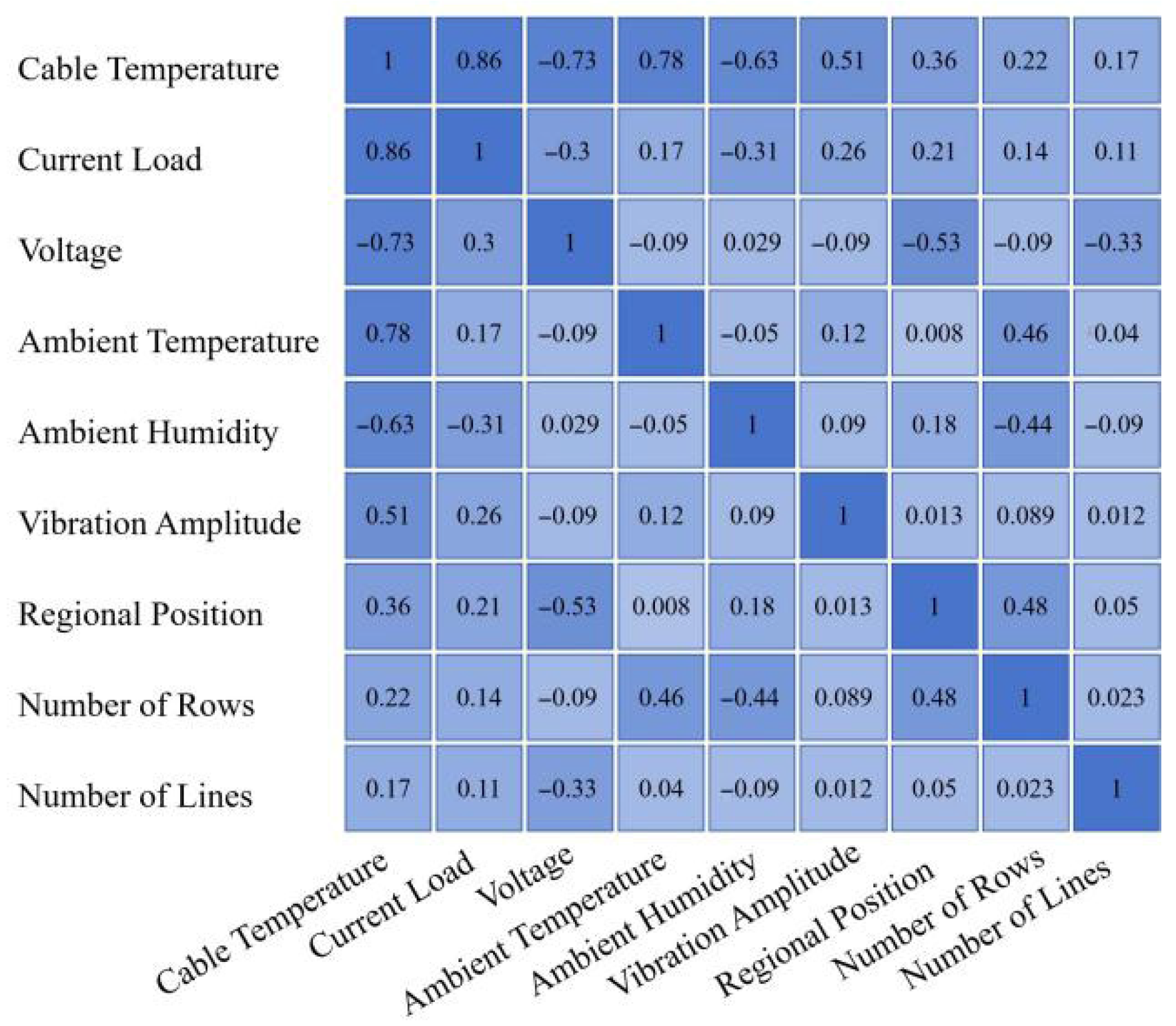 Figure 4. Correlation between cable temperature and different environmental factors. Different colors represent different correlation coefficient values, where dark colors indicate strong correlation and light colors indicate weak correlation.