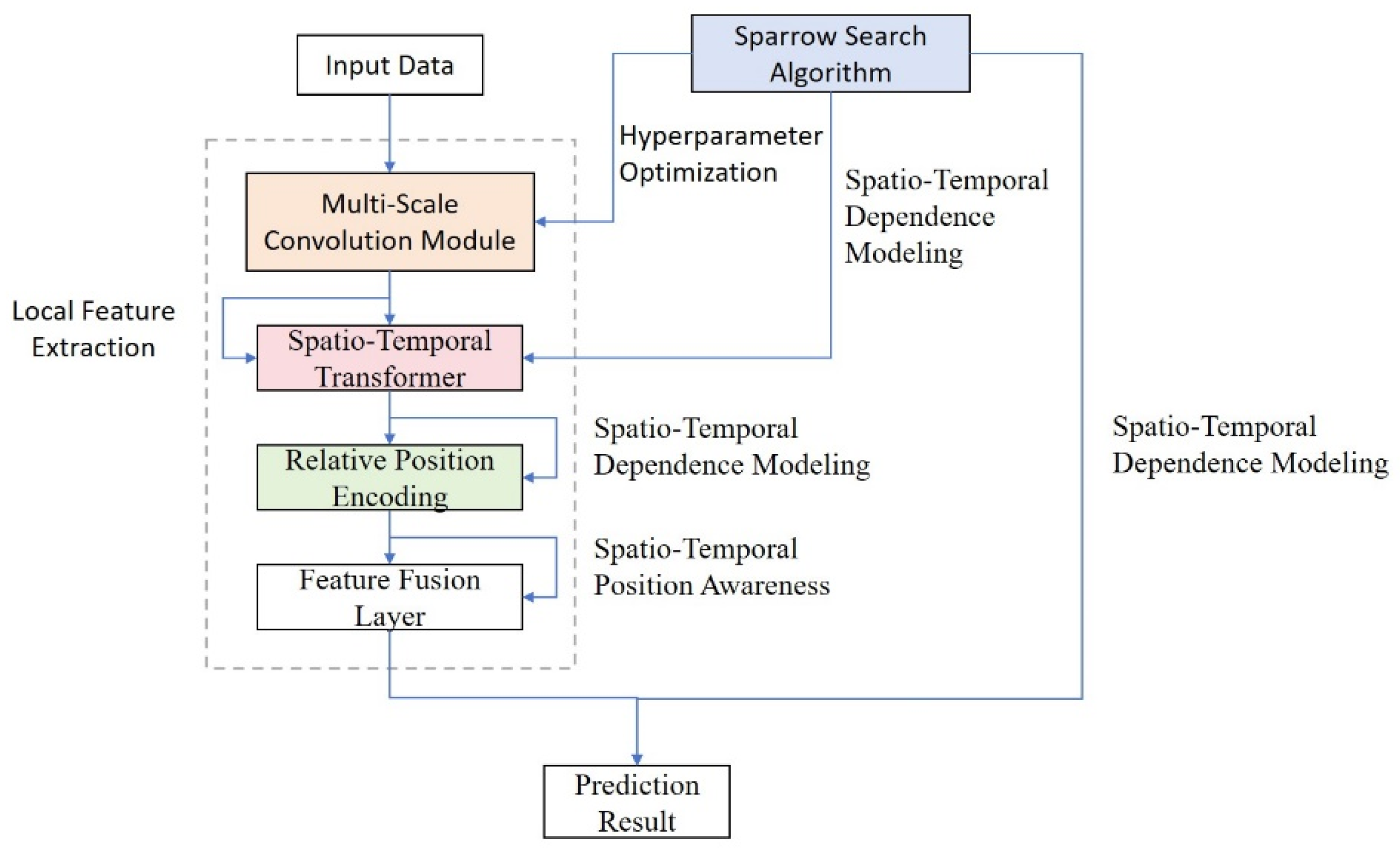 To address the three major challenges in cable temperature prediction—insufficient capture of local features, difficulty in modeling long-range dependencies, and high cost of hyperparameter tuning—this paper proposes a multi-scale spatiotemporal model called MSST-Net. It employs a multi-scale convolutional module to fuse local features with different receptive fields, compensating for the limitations of traditional Transformers in capturing local patterns. A dual-path spatiotemporal attention mechanism is designed to simultaneously model the temporal evolution patterns of temperature sequences and their spatial correlation characteristics. Relative position encoding is introduced to enhance the model’s sensitivity to temporal positions, overcoming the generalization bottleneck of absolute position encoding. The Sparrow Search Algorithm is integrated to achieve automatic hyperparameter optimization, reducing tuning costs and improving model generalization. The model architecture is illustrated in Figure 5.