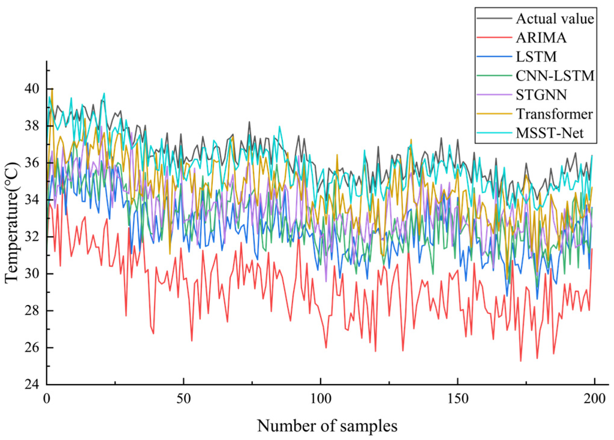 To validate the cable temperature prediction performance of MSST-Net, the same dataset was used for comparison with mainstream advanced algorithms in recent years, including ARIMA, LSTM, CNN-LSTM, STGNN, and Transformer. The models were trained using the training set and their prediction performance was verified on the test set. Among them, ARIMA is a univariate time series prediction model; CNN-LSTM combines CNN for extracting local spatiotemporal features with LSTM for modeling long-term dependencies; STGNN is a standard spatiotemporal graph neural network. R2, MAE, and RMSE were selected as evaluation metrics.