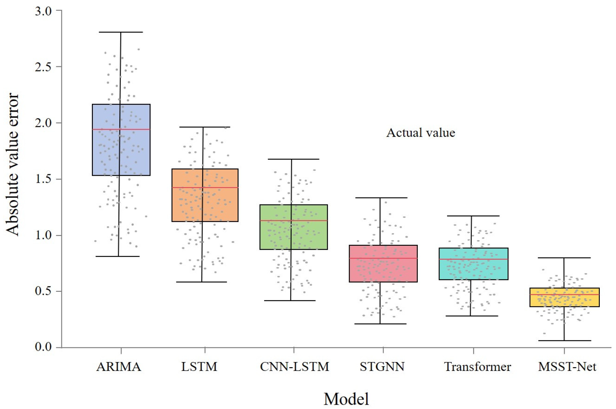 Figure 10 shows the box plots of the absolute prediction residuals for the six models. It can be seen that the box plot length of MSST-Net is significantly smaller than those of ARIMA, LSTM, and CNN-LSTM, and the absolute error values are concentrated around 0.442. The maximum absolute error value is also significantly smaller than other models, indicating that the distribution of its absolute residuals is more concentrated and the prediction results are more stable.