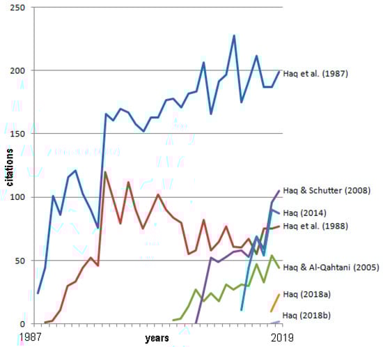 Changes in the number of citations of the eustatic reconstructions by B.U. Haq and his co-workers.