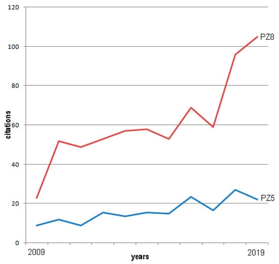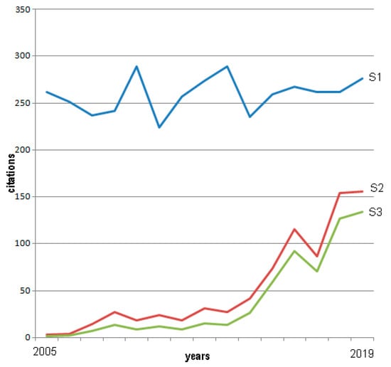 Even so, may geologists still refer to the ‘classical’ reconstructions of Haq et al. [23,24] without considering their updates. This represents a pattern of research community unawareness. The question under consideration is the degree unawareness and, thus, its influence on modern science. To evaluate the degree of observed unawareness, citation dynamics are analyzed for each ‘classical’ work [23,24] and each updating work [34,35,36,37,38]. The number of the relevant citations is counted for all years since 1987 when the first ‘classical’ work [23] was published. For better clarity, several specific parameters are considered, namely S1 (the sum of citations of two ‘classical’ works), S2 (the sum of citations of the updating works dealing with the Mesozoic–Cenozoic interval [34,36,37,38]), S3 (S2 corrected in regard to the Paleozoic—see below), PZ5 (the corrected number of citations of [34]), and PZ8 (the number of citations of [35]). Corrections concerning the Paleozoic are necessary because the ‘classical’ reconstructions [23,24] deal with only the Mesozoic–Cenozoic interval, whereas the first updating paper [34] deals with the entire Phanerozoic. If so, a part of citations of the latter cannot be considered as the evidence of awareness concerning the update of the previous version of the curve. Taking this into account, the number of citations of [34] is diminished tentatively by a factor of two (hypothetically, half of citations can be linked to the Paleozoic counterpart of the curve) for calculating S3 and PZ5.