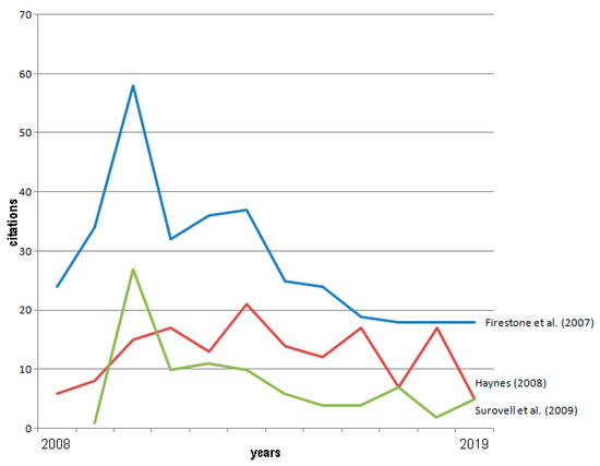 The end-Pleistocene events, including climatic perturbations (Younger Dryas cooling) [39,40,41] and megafaunal extinctions (disappearance of mammoths, ground sloths, etc.) [42,43] have attracted significant attention of geologists for decades because of their ‘sudden’ character and unclear causes. A new round of debates began at the end of the 2000s, when Firestone et al. [44] proposed a hypothesis of the end-Pleistocene extraterrestrial impact to explain a chain of the noted events. The first reaction by the research community was somewhat mixed (e.g., [45,46]). The evidence in support of this hypothesis [47,48,49,50,51,52,53,54,55,56,57,58,59] and against it [17,40,60,61,62,63,64,65,66,67] accumulated in the following years, and debates have continued despite some attempts to proclaim this hypothesis as ‘finally’ rejected. From all the relevant literature that continues to grow, three papers seem to be especially important. These are the original (hypothesis proposal) study by Firestone et al. [44], the article by Haynes [45] where he judged the hypothesis to need testing, and the review by Surovell et al. [66], where arguments against this hypothesis were gathered (importantly, Haynes is among the co-authors of the rejection camp). The outstanding character of these papers is underlined by the total number of their citations relative to the other publications (350 citations of [44], 153 citations of [45] and 90 citations of [66]). Importantly, these basic papers were published at the end of the 2000s, and the tracking of their citation dynamics allows forthe analysis of the research community’s awareness of the hypothesis through the 2010s.