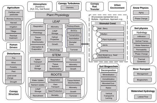 At present, LSMs have expanded from their initial simple biophysical configurations [20] to include representations of stomatal functioning [21], scaling information from leaf to canopy [22], soil moisture dynamic and surface hydrology [23,24], crop processes [25,26], land surface heterogeneity [27], dynamic vegetation [28,29], urban environment [30], land cover management [31,32], plant demographic processes and plant hydraulics [33], groundwater dynamics [34], soil microbial dynamics [35], leaf mesophyll process, nitrogen, phosphorus, carbon cycling and their mutual interactions [36]. The incorporation of processes in LSMs is driven by the need for extensive user communities, including ecologists, crop modelers, atmospheric scientists, biogeochemists, hydrologists, who explore interactions between different components of the system. Some widely used LSMs across the globe include Interaction Soil-Biosphere-Atmosphere (ISBA, [36]), The Community Land Model (CLM, [31]), JSBACH [37], Joint UK Land Environment Simulator (JULES, [38]), LPJ-GUESS [39], Noah-MP [40]. Along with the increasing capability of representing processes, LSMs are enhancing their spatial resolution as well, with the improvement in resolution of the atmospheric models. As the scope of LSMs broadens with the support of computational advancements, the questions of cognitive uncertainty and unresolved heterogeneity emerges as a challenge.