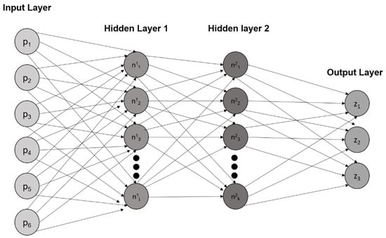 ANN is the supervised learning approach to approximate relationships between input and output using interconnecting units called neurons. The development of ANNs was motivated by the functioning of the human brain. Like the brain, the connections between neurons decide the function of the network. Multiple inputs given to the neuron are assigned with different weights, calculated by minimizing a loss function, that collectively determines the importance of input signals [77]. This part is termed as ‘training’ and some popular training methods are backpropagation, evolutionary algorithm and gradient descent. Output signal is produced by the summation block, which adds all of the weighted inputs algebraically. The input and output layers are called ‘visible layers’ as they are directly connected to inputs and outputs, respectively. Hidden layers are the layers in the middle (see Figure 2). ‘Activations’ are the outputs sent to the (i + 1)th layer from the ith layer, which is calculated based on the transformation functions (such as sigmoidal, tanh, rectified linear units or ReLU) of combined input from (i − 1)th layer. ‘Width’ is defined by the number of neurons on a layer and ‘depth’ is defined by the number of layers in the network.