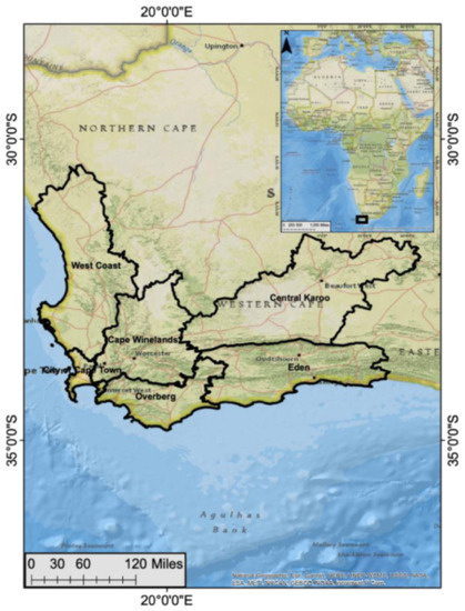 The study domain depicting the six main districts (City of Cape Town, West Coast, Cape Winelands, Overberg, Garden Route, Central Karoo) in the Western Cape region (South Africa). The black solid line delineates the political boundary of each main district in the Western Cape.