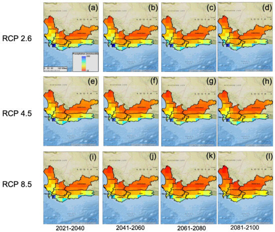 Spatial–temporal patterns of precipitation in Western Cape, South Africa (for 2021–2100) for 3 emission scenarios: (a–l) exhibit the precipitation projection pattern for the each 20-year span from 2021–2100 under the 3 different GHG emission scenarios.