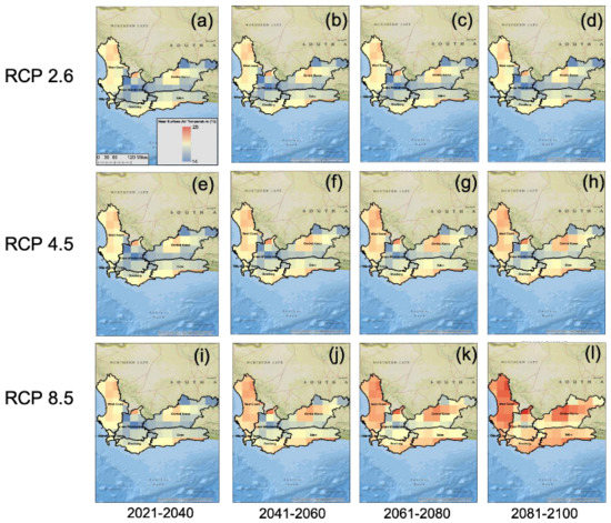 Spatial–temporal patterns of near-surface air temperature in Western Cape, South Africa (2021–2100) for 3 CO2 emissions scenarios: (a–l) exhibit the mean near-surface air temperature projection pattern for the each 20-year span from 2021-2100 under the 3 different GHG emission scenarios.