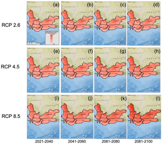 Spatial–temporal patterns of daily maximum surface air temperature in Western Cape, South Africa (2021–2100) for 3 CO2 emissions scenarios: (a–l) exhibit the daily maximum surface air temperature projection pattern for the each 20-year span from 2021–2100 under the 3 different GHG emission scenarios.