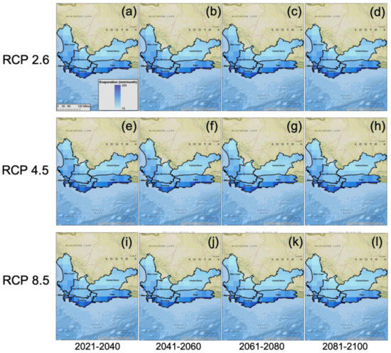Spatial–temporal patterns of spatially distributed evaporation in Western Cape, South Africa (2021–2100) for 3 CO2 emissions scenarios: (a–l) exhibit the evaporation projection pattern for the each 20-year span from 2021–2100 under the 3 different GHG emission scenarios.