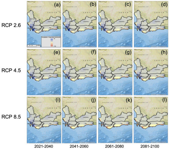 Spatial–temporal patterns of net available water in Western Cape, South Africa (2021–2100) for 3 CO2 emissions scenarios: (a–l) exhibit the net available water projection pattern for the each 20-year span from 2021-2100 under the 3 different GHG emission scenarios.