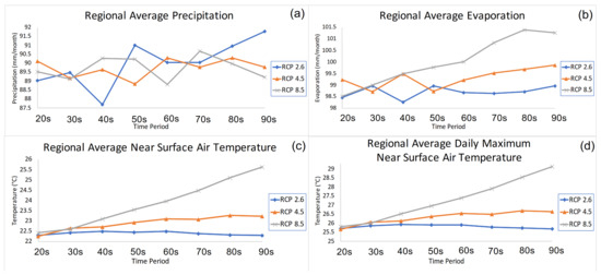 Projection of regional averaged climate metrics in Western Cape, South Africa for 3 CO2 emissions scenarios: (a) regional average precipitation; (b) regional average evaporation; (c) regional average near-surface air temperature; (d) regional average daily maximum surface air temperature.