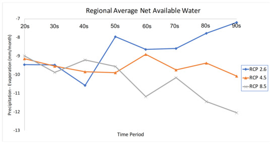 We calculated the regional average for all the climate metrics to assess the overall impact of various emission scenarios on Western Cape Province. In terms of precipitation (Figure 7a), there is not much fluctuation under both the RCP 4.5 and RCP 8.5 scenarios. However, there is an approximately 3.5% increase of rainfall with greater variability under the scenario of the RCP 2.6 from the year 2020 to the end of the 21st century. For evaporation (Figure 7b), there is no significant increase under both the RCP 2.6 and RCP 4.5 scenarios; however, there is a steady increasing trend with about a 3.1% increase of evaporation in 2100 under the RCP 8.5 scenario. In other words, emissions increases will bring more rainfall while causing more evaporation. However, both water-related characteristics did not display a linear trend over time, as opposed to the trends of those temperature metrics. Figure 7c,d shows that rates of change of temperature metrics are faster compared to those of precipitation and evaporation over time, indicating higher sensitivities of temperature metrics to GHG emissions. Figure 8 is a clear indication of how more emissions will increase the likelihood of water crises in the Western Cape. While the net water availability is negative under all three emissions scenarios, the values under the RCP 2.6 and RCP 8.5 scenarios exhibit the opposite trend: For the RCP 2.6 scenario, water availability condition in the Western Cape area improves after 2060 while the situation continues to get worse and worse under the RCP 8.5 scenario.