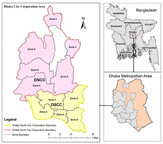 Location and extent of the study area (source: modified from [41]). Note: DNCC = Dhaka North City Corporation and DSCC = Dhaka South City Corporation.