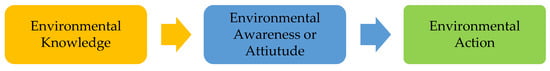 The Behavioral Change Model by Hungerford and Volk [42] was used in this study. The model expresses the link between environmental knowledge, attitude or awareness, and responsible environmental action (Figure 2). The environmental perception of human beings inspires the environmentally friendly attitude or understanding that also stimulates human psychology to grow environmental acting. Again, environmental knowledge and behavior depend on the demographic characteristics [43,44,45]. Thus, the respondents’ status of experience and observation about environmental pollution assumes their environmental behavior and actions in the study area, indicating the severity of environmental pollution in developing countries.