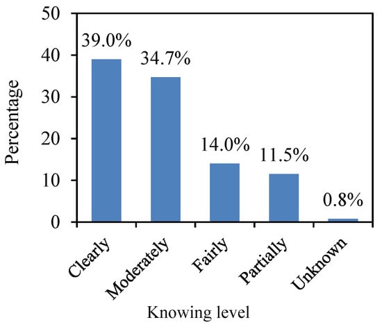 In the study area, respondents were asked whether they knew about the types, causes, and effects of environmental pollution. According to their replies, around 39% of respondents knew about these clearly, 34.7% moderately, 14.0% fairly, and 11.0% partially. Only 0.8% of people did not understand the causes of environmental pollution (Figure 3).
