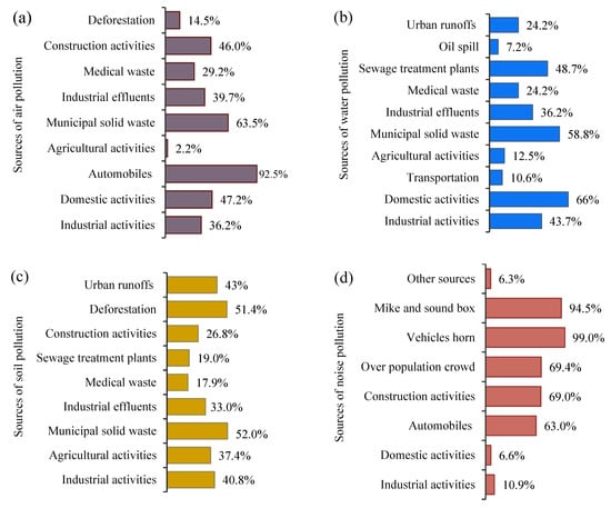 Based on the dwellers’ responses in the study area, in the case of air pollution, around 92.5% of respondents stated that automobiles are the most important source of air pollution in the city. About 63.5% of respondents stated municipal solid waste to be a source of air pollution, 47.2% domestic activities, 46.0% construction activities, 39.7% the discharge of industrial effluents, 36.2% industrial activities, 29.2% medical waste, 14.5% deforestation, and 2.2% agricultural activities (Figure 5a).