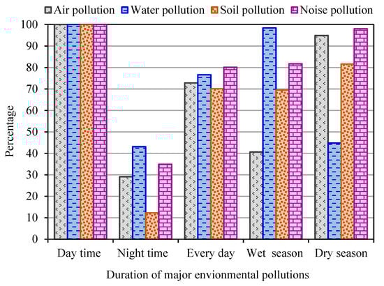 Water pollution is a regular phenomenon in the daytime in the study area, but about 43% of respondents also think it happens during the night. Approximately 76.6% of people observed water pollution every day of the week, and about 98.4% of people experienced it in the wet season; only 44.8% of people noticed this pollution in the dry season. Generally, the degree of water pollution is higher in the dry season. However, water bodies are almost dried up in this season, so water pollution is not visible to the study area respondents. About 100% of respondents encountered soil pollution in the daytime, whereas only 12.3% also thought it happens during the night. About 70% of people observed soil pollution every day of the week, and around 70.1% of people experienced it in the wet season; 81.7% of people found this pollution in the dry season. Each and all respondents mentioned experiencing noise pollution in the daytime, but 34.9% also experienced it during the night. Around 80.1% of people experienced noise pollution every day of the week, and about 81.7% of people experience it in the wet season; 98.0% of people observe it in the dry season (Figure 5).