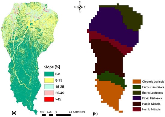 Soil data is essential for hydrological simulations with SWAT. Soil physical and chemical properties (texture, organic carbon, bulk density, soil available water content, hydraulic conductivity and bulk density) in soil layers help as determining factors for surface runoff []. Soil data were obtained from the Food and Agriculture Organization (FAO) Harmonized global soils database at http://www.waterbase.org/download_data.html (accessed on 17 May 2020). The watershed boundary was used to extract the soil data from the FAO soil database of the African soils slice. The soil map comprised six categories (Figure 2b). The attributes of these soils were updated using a “user soil” table from the MapWindow SWAT12 database due to the fact that the “user soil” table of ArcSWAT12 soil database contains USA soils only.
