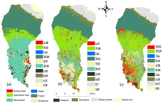 Percentage coverage for the land cover maps for the years 1993 (a), 2006 (b), and 2018 (c).