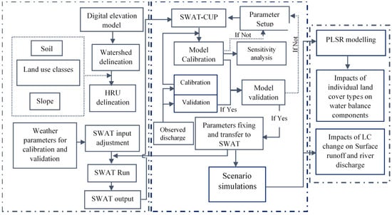 The methods and steps applied in this study to assess LUC change impacts on hydrological processes in KWK watershed are summarized in Figure 4. The figure can be split into three major blogs: the SWAT model set up and parameterization (left-hand side), SWAT model calibration and validation, and fine-tuning of the model (middle blog). The last blog (right-hand side) presents the PLSR modeling and assessment of impacts of land use and cover changes on hydrological processes.