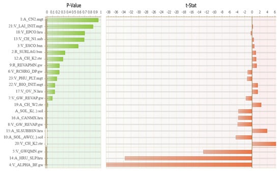 The sensitivity analysis showed that there are nine most sensitive parameters of the KWK SWAT model that minor changes in their values were found to influence river flow, shown in Figure 5. These parameters were those with p-value ≤ 0.05. The parameters include a_CN2.mgt, v_ALPHA_BF.gw, a_HRU_SLP.hru, v_GWQMN.gw, a_CH_K2.rte, a_SOL_AWC().sol, a_SLSUBBSN.hru, v_GW_REVAP.gw, a_CANMX.hru and SOL_K().sol. The t-statistical values of the parameters are used to rank the parameters in the order of magnitude of their influence on the streamflow. According to Abbaspour [], the higher the absolute t-test values, and low p-values, the more sensitive the parameter. The information regarding parameters sensitivity analysis is always helpful in making modelers’ work easy as it highlights which parameters to fine-tune during calibration of a hydrological model.
