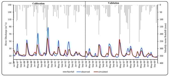 The calibration and validation curves plotted together with mean monthly rainfall are shown in Figure 6. The rainfall and monthly river discharge in Figure 6 show that the model captured well hydrologic processes within the watershed. Generally, the simulation reflected the observed flow, which shows that the model can efficiently simulate the hydrological impacts of land use changes over the 1993–2030 periods.