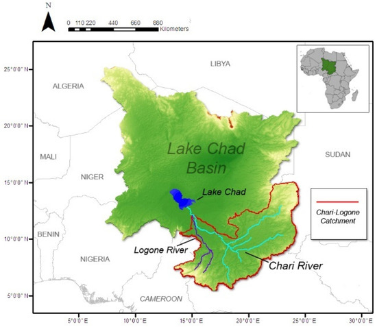 The Chari–Logone catchment (CLC), a sub-basin of the LCB located south of Lake Chad, was chosen for this study because it provides more than 90% of the water input to Lake Chad and is the main driver for the entire lake system [37]. The Chari and Logone rivers provide an average of 1946 mm/year to the lake, whereas direct rainfall contributes a mere 329 mm annually [38]. The spatial extent of the study area is 601,350 km2, and it is located within the borders of Cameroon, Chad, Central African Republic, and Sudan. The Chari River originates in the Central African Republic, while the Logone river does so on the Adamawa plateau in Cameroon. The catchment lies between 5° N and 15° N at the eastern part of the Sahel (Figure 1). The topography of the CLC is a plain of clayey soils in the northern region and laterite deposits in the south. The CLC is located in the Chad Graben, which formed prior to the upper Jurassic. The stratigraphic sequence of the Chad Graben is composed of fine and coarse sands along with reddish and gray clays from the Cretaceous period [39].