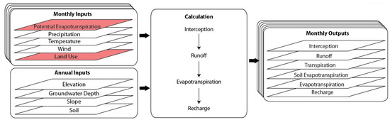 WetSpass-M utilizes raster data, and calculations are performed on a cell-by-cell basis where the input data are geospatially overlayed and sub-divided into vegetated, bare soil, open water, and impervious surface fractions. Water balance calculations of each pixel are processed in the following order: interception (process 1); surface runoff (process 2); evapotranspiration (process 3); and recharge (process 4) (Figure 2). Additionally, land-use/land-cover fraction values for each pixel are used as weighting factors for the calculation of the water balance [36].