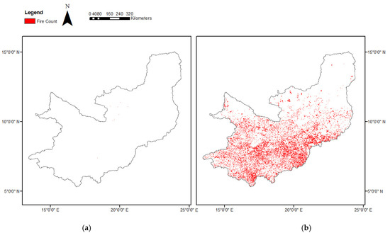 Two different land cover datasets were created, one considering burning and one without burning. The dataset considering burning combined the land classification raster with fire counts derived from MOD14/MYD14 Collection 5 fire data. MOD14 data are derived from a fire detection algorithm which takes the two 4 µm channels, numbered 21 and 22. Classification of a pixel as containing fire is only considered if it satisfies a variety of conditions which indicate a strong probability that it contains fire [55,56]. For each grid cell, Terra/Day or Terra/Night settings were selected based on which had the most fire detected; this value was then used for the day. Each daily total was then summed in order to obtain a monthly value per grid cell (Figure 3a,b). Although the monthly value represents one overpass per day, the data are not quantitatively representative of the diurnal burn pattern, however do provide statistically qualitative information. The fire data were then overlaid onto the land cover map using GIS to simulate which vegetated areas were likely affected by burning.
